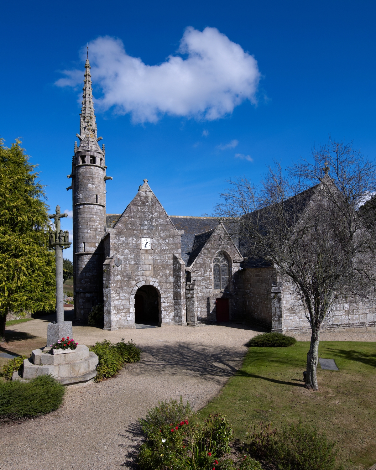 Trémel, le bourg : église paroissiale Notre-Dame, vue générale sud. Au premier plan à gauche : calvaire daté de 1865Immatriculation