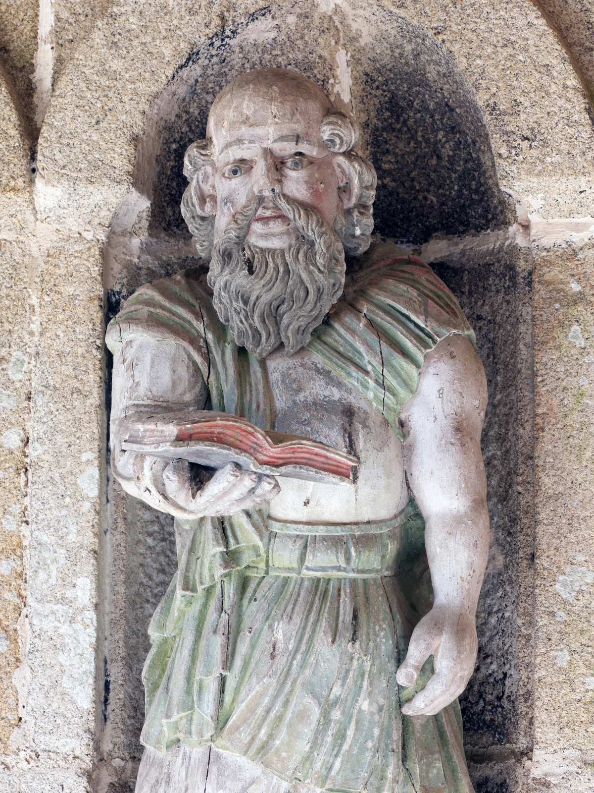 Trémel, le bourg : église paroissiale Notre-Dame, porche sud, détail de l'une des 12 statues des apôtresImmatriculation