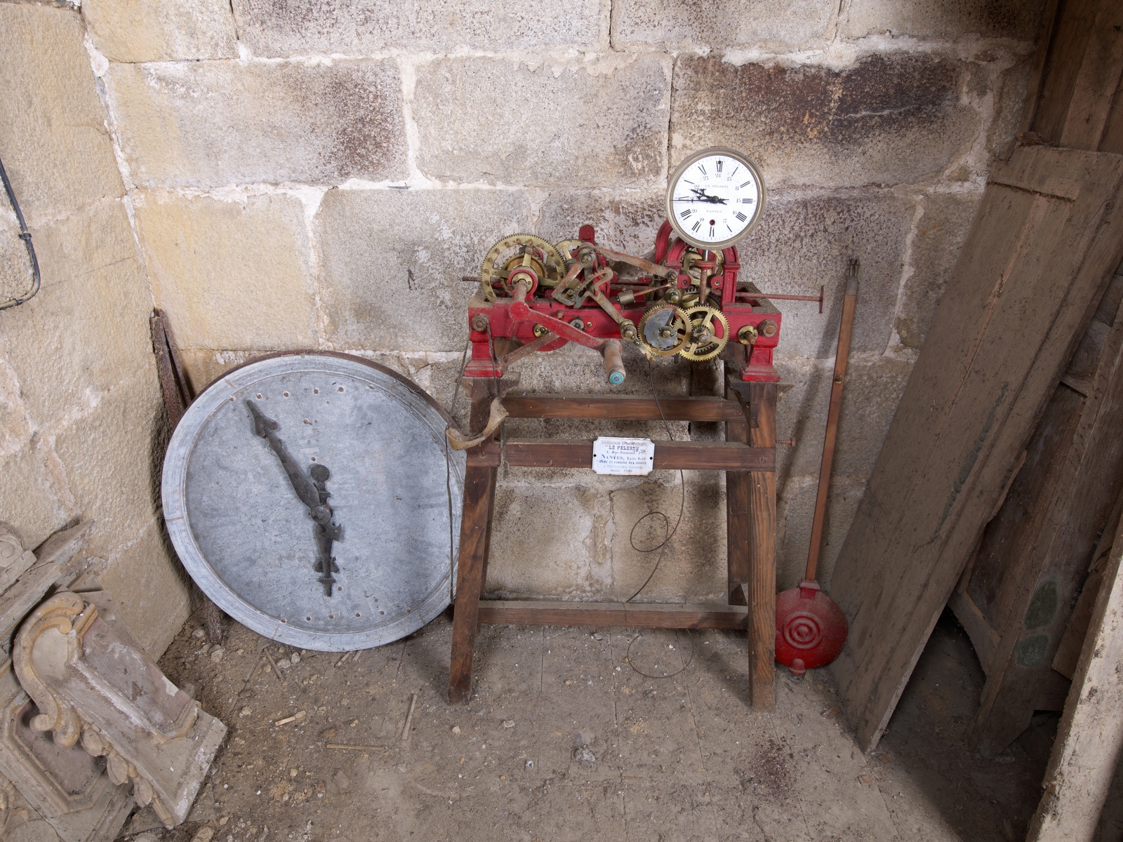 Trémel : église paroissiale Notre-Dame, vue intérieure, pièce située au-dessus du porche sud, mécanisme de l'ancienne horlogeImmatriculation