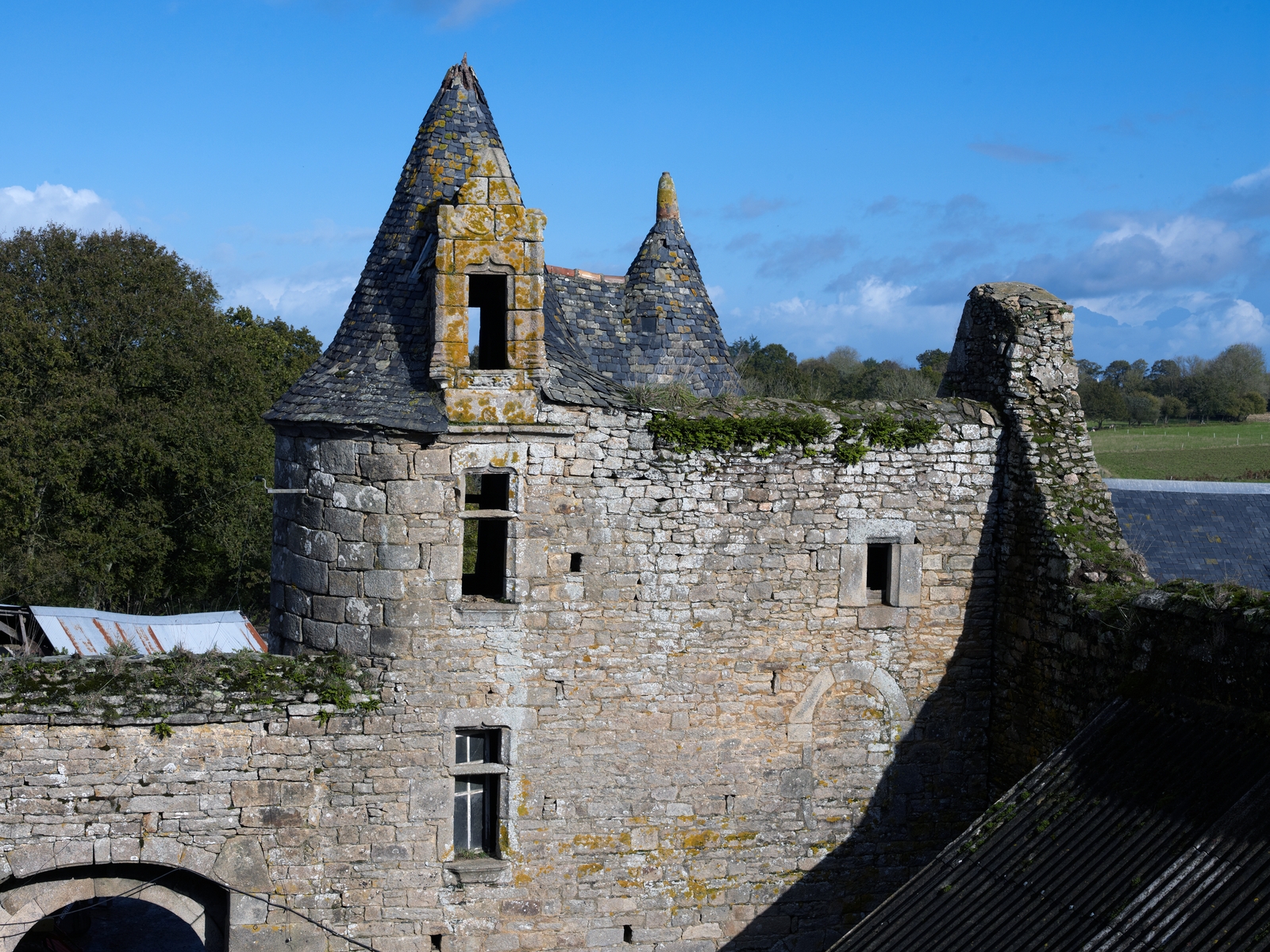 Trémel : manoir de Kermerzit, tour autrefois desservie par une galerie (porte murée à l'étage). Il est probable que cette tour ait pu servir de logement à un chapelain affecté à l'office de la chapelle seigneurialeImmatriculation