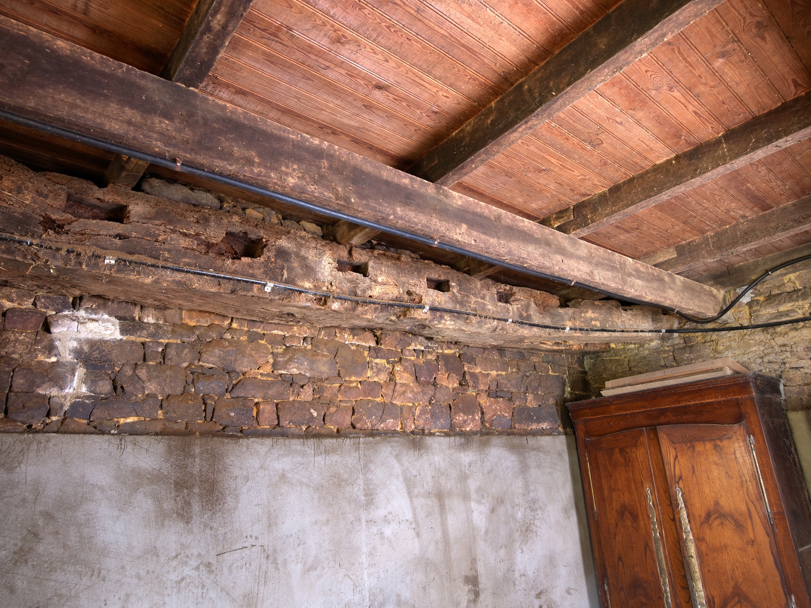 Trémel : manoir haut de Kermerzit, vue intérieur du cellier (à l'est), détail de la poutre et des entailles destinées à y ficher les solivesImmatriculation