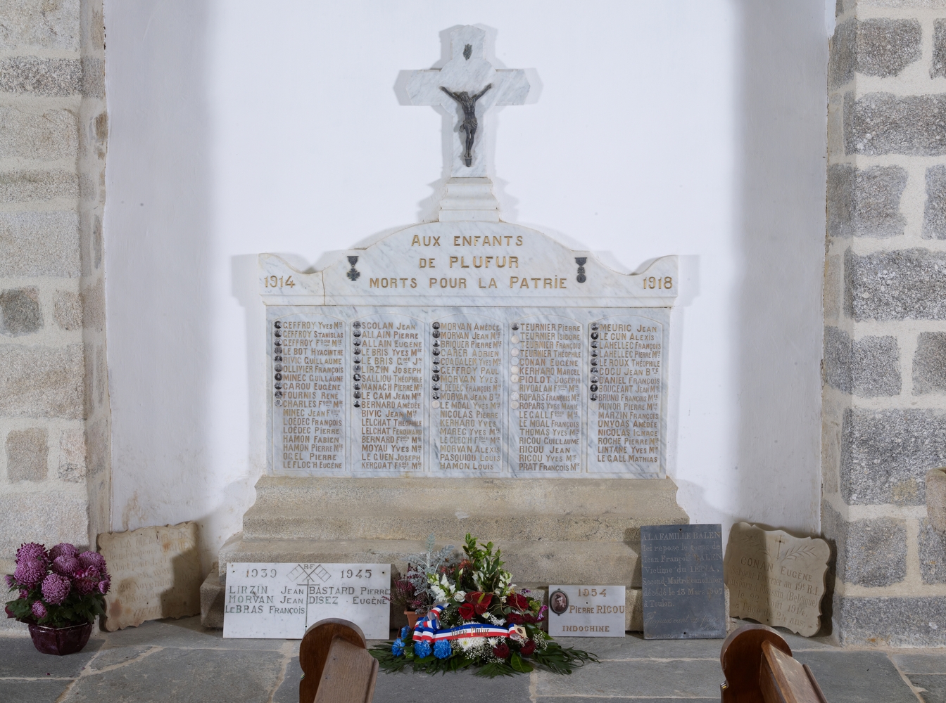 Plufur, le bourg : église paroissiale Saint-Florent, monument aux morts et plaques de souvenirs ou remerciementsImmatriculation