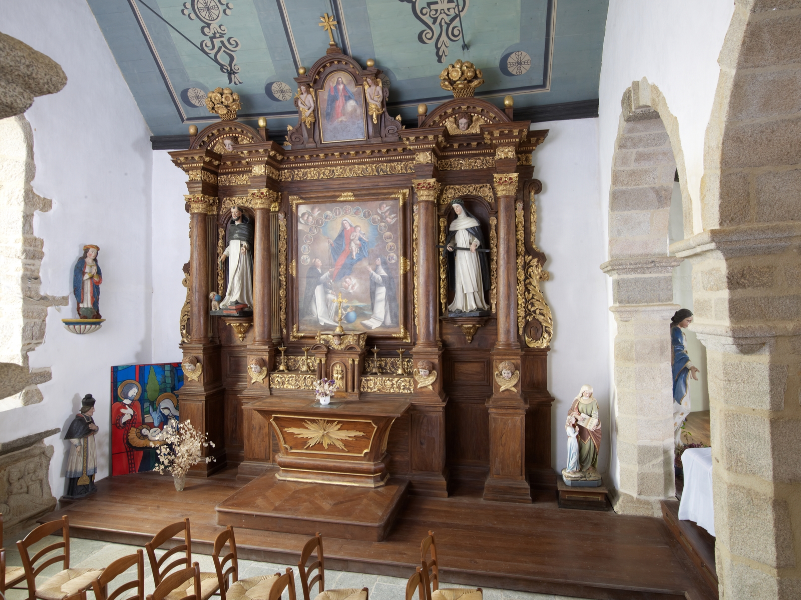 Plufur, le bourg : église paroissiale Saint-Florent, transept nord, autel et retable du 17e siècle portant les armes de Quelen et Coskaer, armes d'Yves de Quelen et de Julienne du Coskaer. Le tableau central de Loyer Aîné, peintre à Etables, est datée 1842 : il représente le clocher et le presbytère de Plufur avec en arrière plan, la mer et des naviresImmatriculation