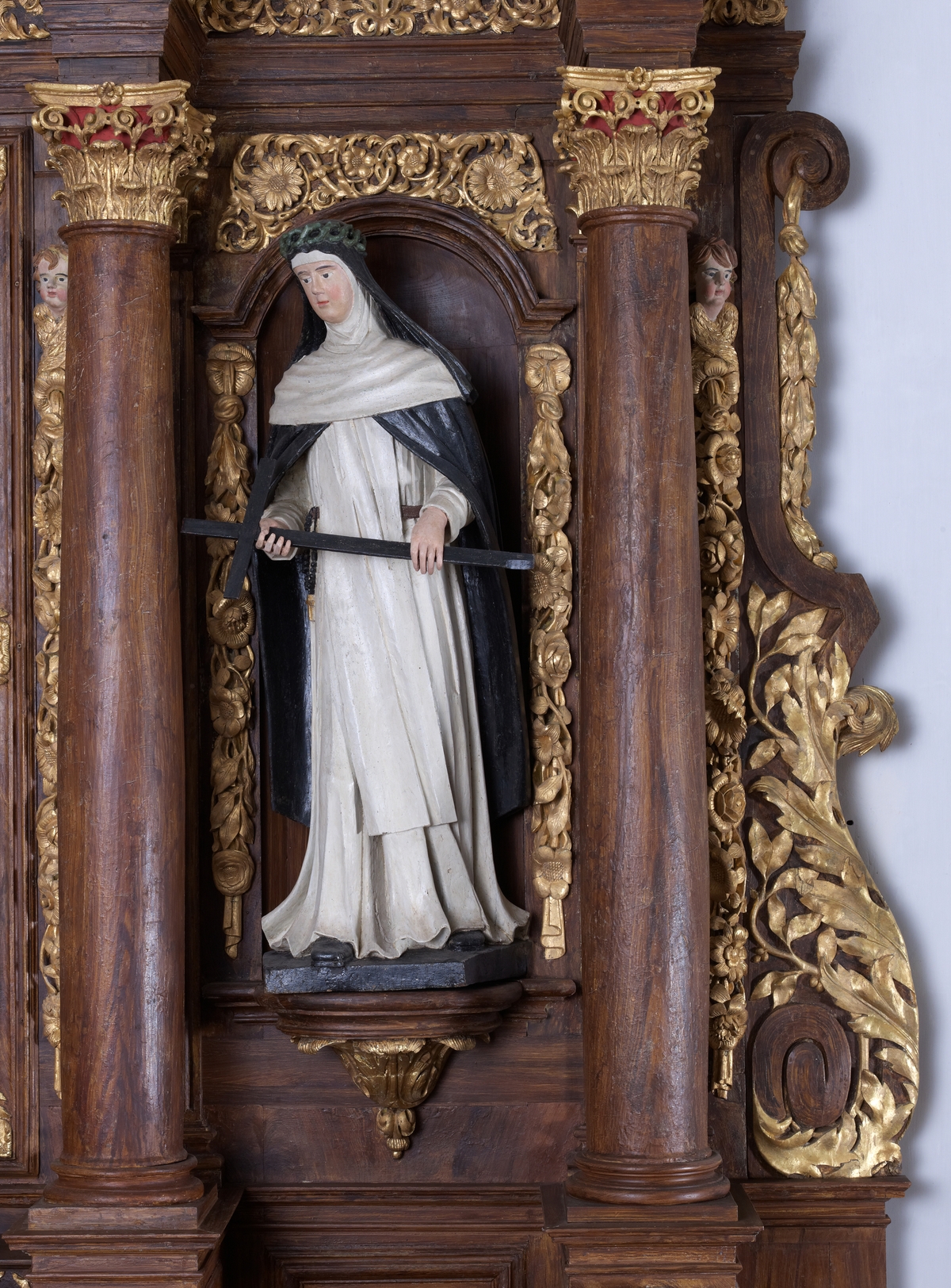 Plufur, le bourg : église paroissiale Saint-Florent, transept nord, détail du retable du 17e siècleImmatriculation