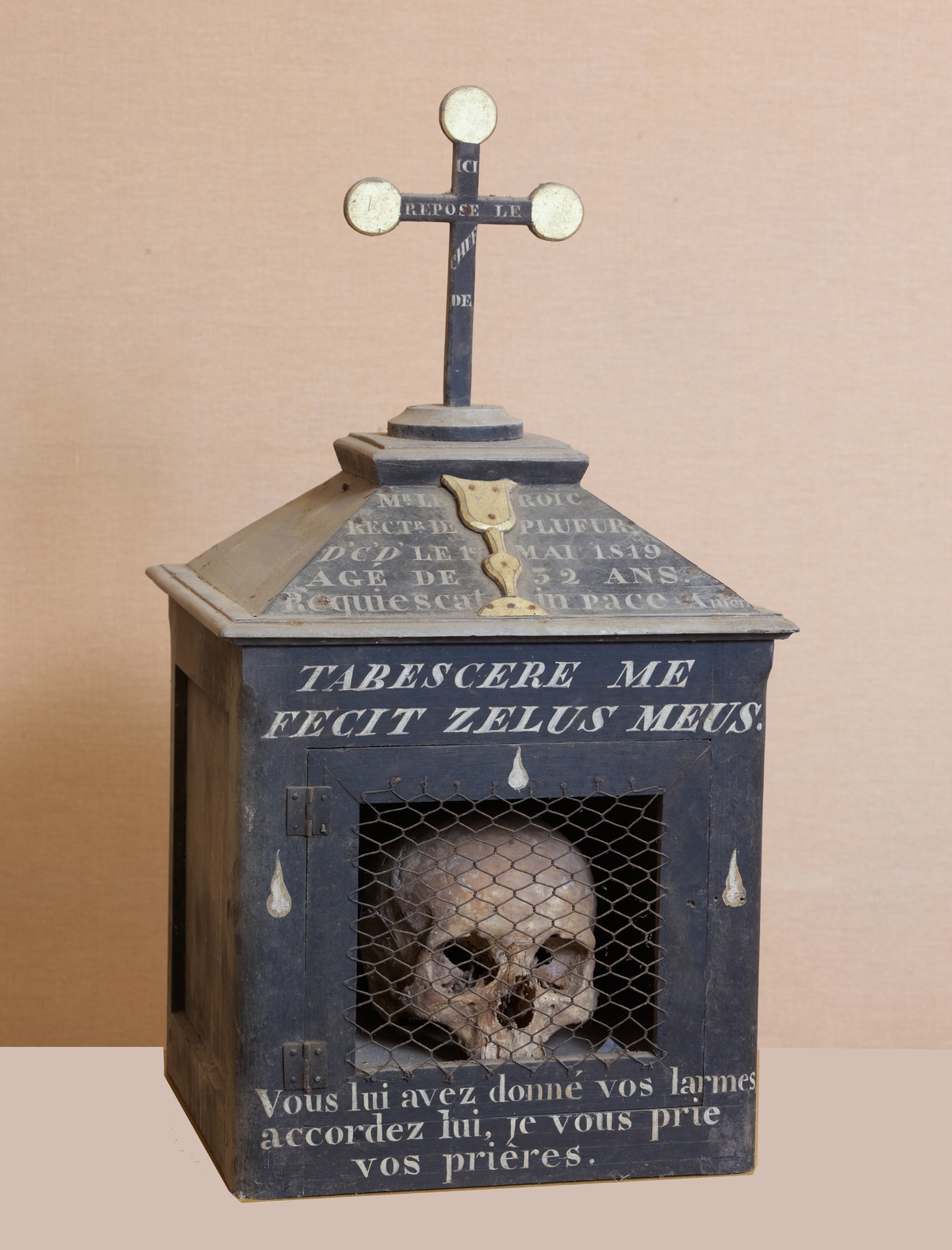 Plufur, le bourg : église paroissiale Saint-Florent, boîte à crane du recteur Le Roïc. On peut lire l'inscription suivante : "ICI REPOSE LE CHEF DE / M[onseigneu]R LE ROÏC / RECT[eur]R DE PLUFUR / D'C'D' [décédé] LE 1er MAI 1819 / AGE DE 32 ANS. / REQUIESCAT IN PACE AMEN / TABESCERE ME FECIT ZELUS MEUS / VOUS LUI AVEZ DONNE VOS LARMES / ACCORDEZ LUI, JE VOUS PRIE / VOS PRIERES"Immatriculation