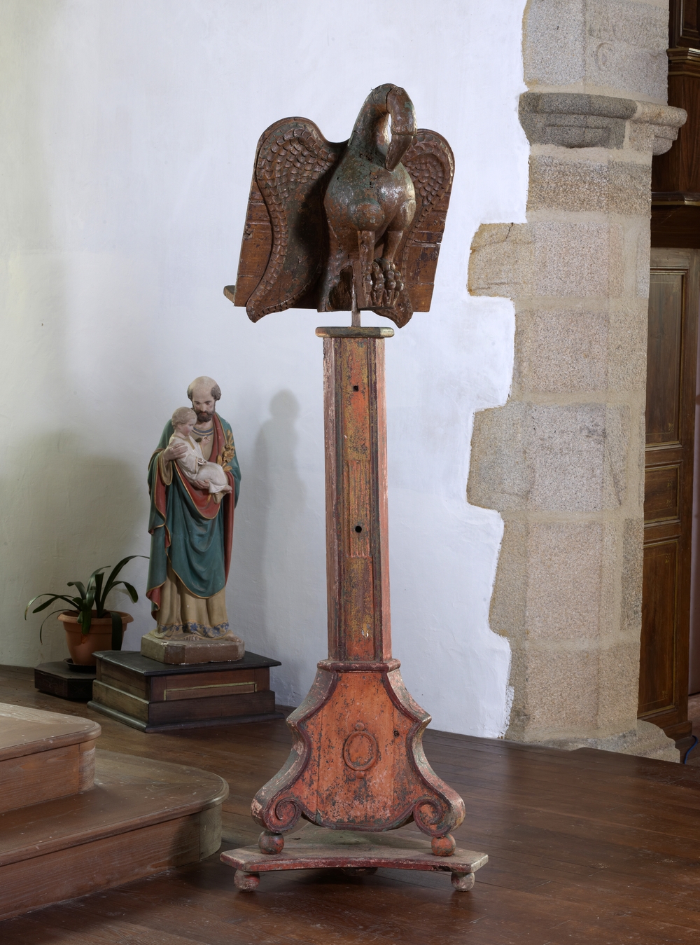 Plufur, le bourg : église paroissiale Saint-Florent, lutrin datable du 18e siècle. L'oiseau est un mitigé d'aigle (d'où la présence de serres) et de pélican (qui enfonce son bec dans sa poitrine et ses plumes pour nourrir ses petits)Immatriculation
