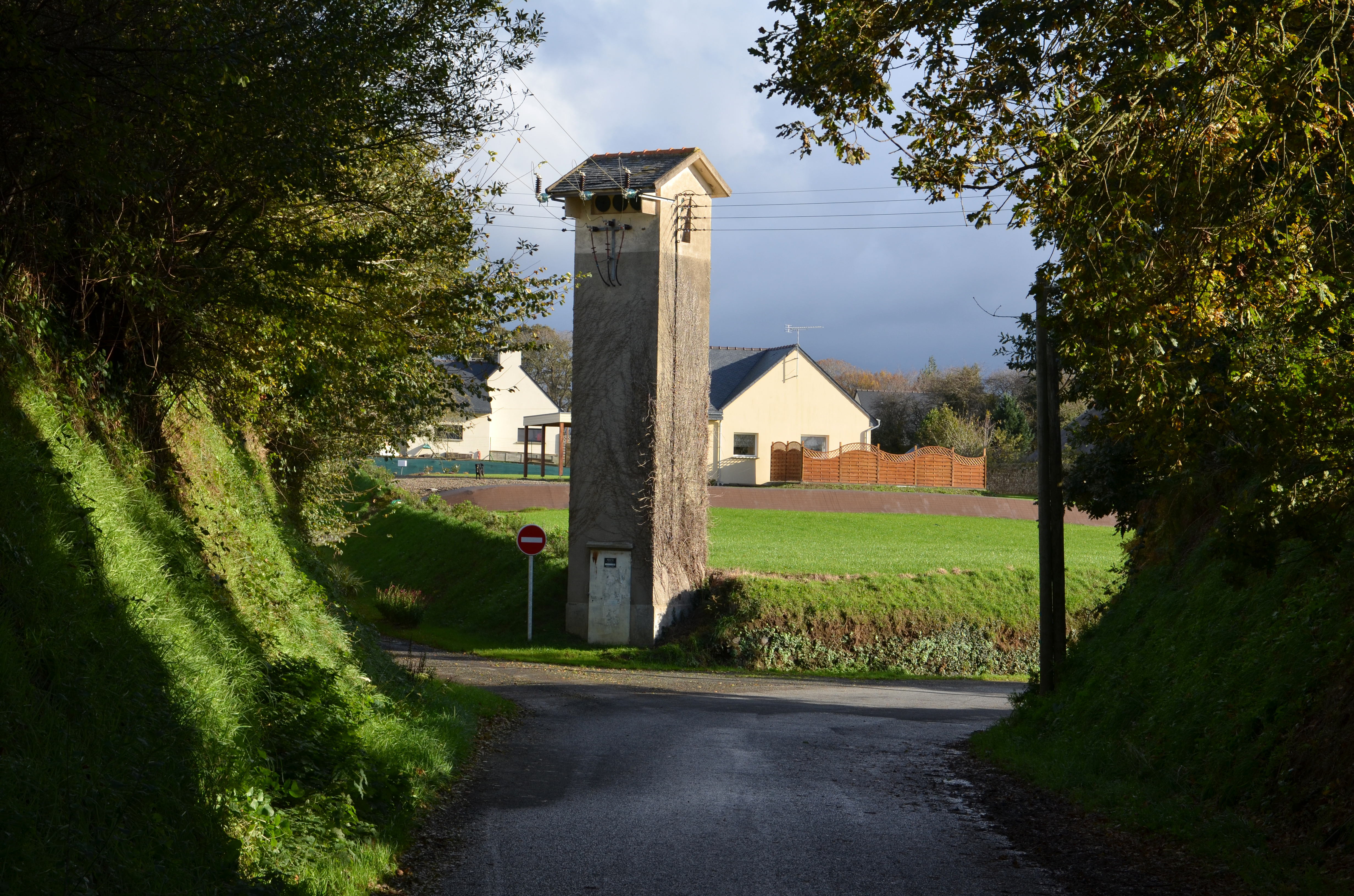 Mantallot, le bourg : transformateur électrique, vue générale depuis l'ouest. En arrière plan : le lotissement Park Mézou (1er quart du 21e siècle)Immatriculation