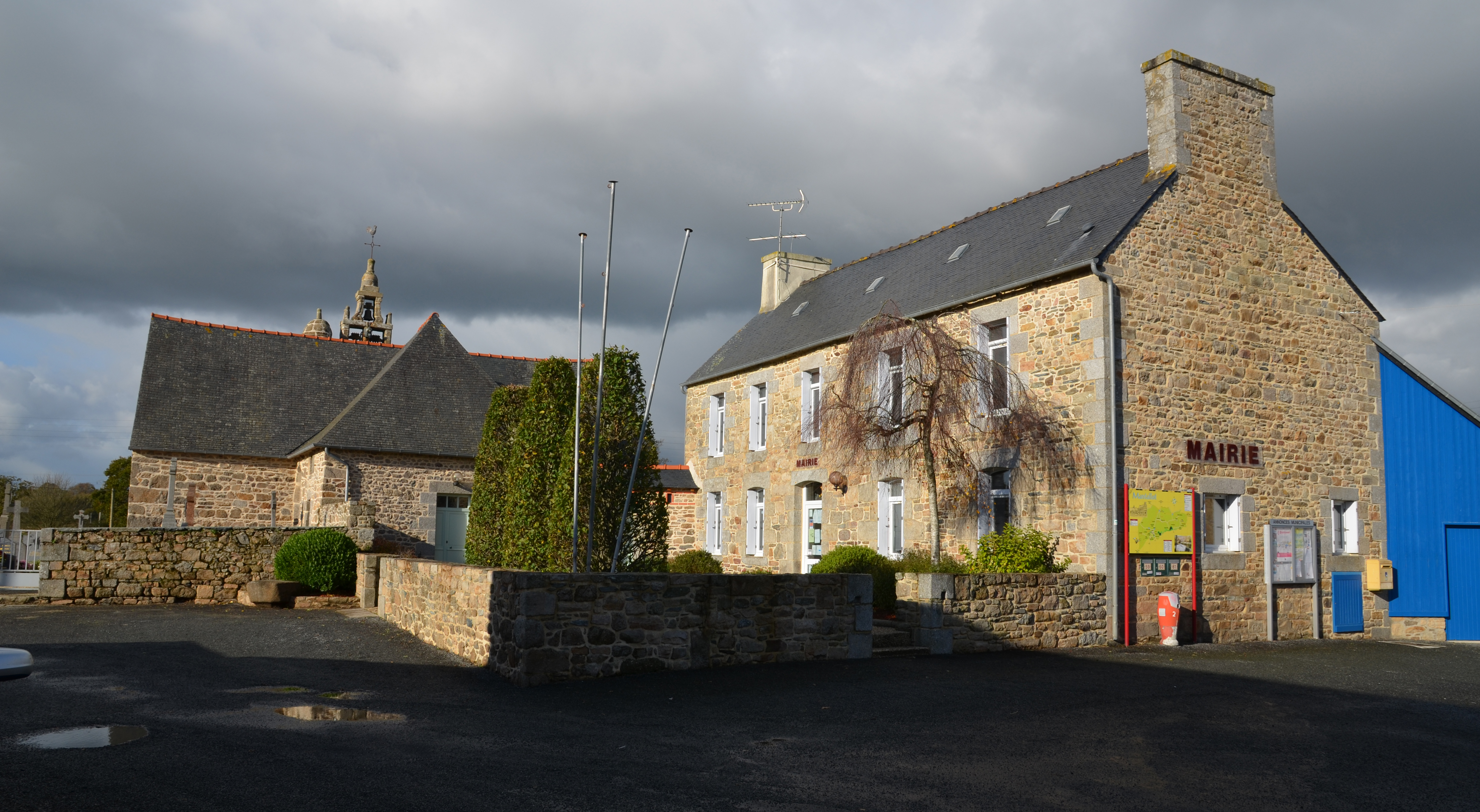 Mantallot, le bourg : ancien presbytère aujourd'hui mairie et église paroissiale Saint Médéric, vue de situation depuis le sud-est. Il porte le millésime 1773Immatriculation