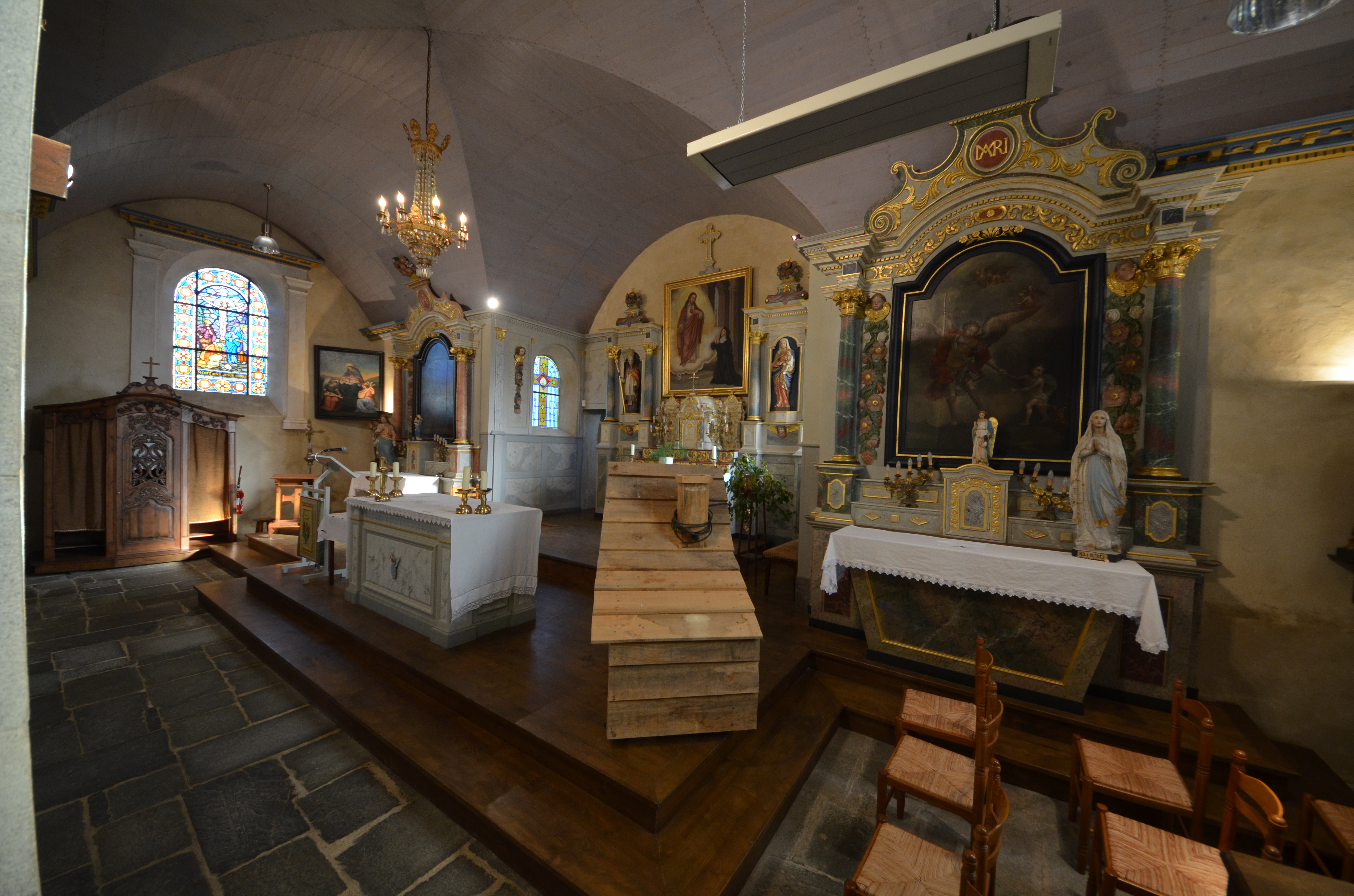 Mantallot, le bourg : église paroissiale Saint Médéric, vue intérieure vers le chœur. Au premier plan, le retable du transept sudImmatriculation