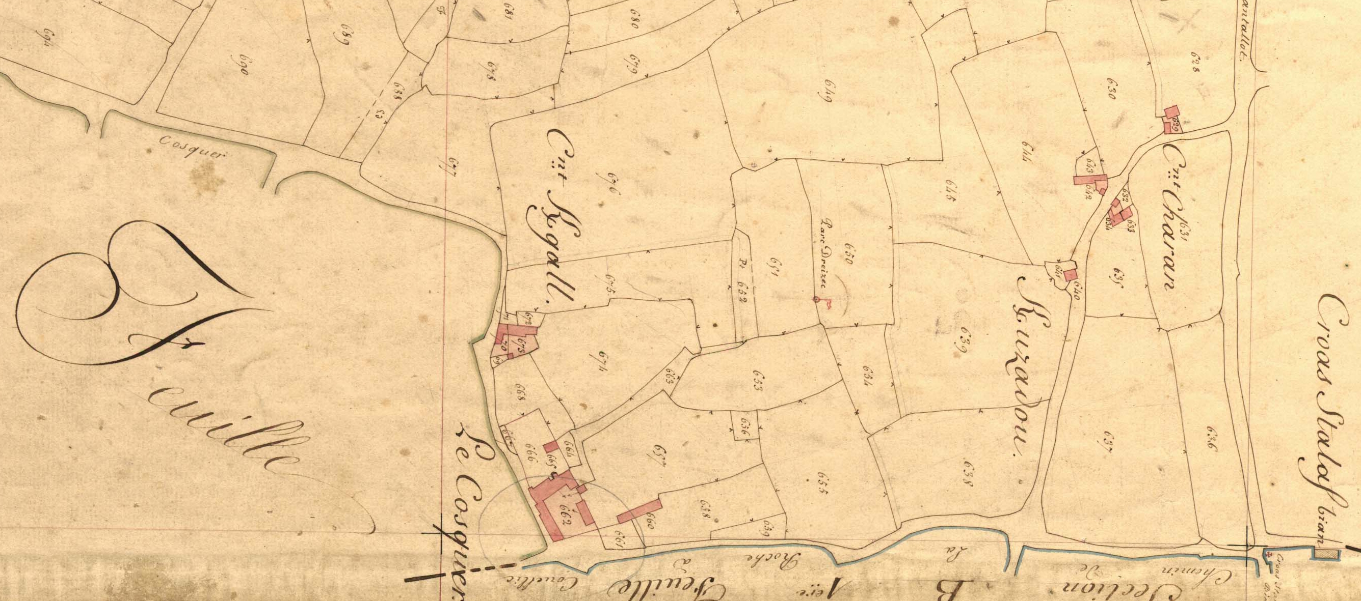 Extrait du cadastre ancien de la commune de Langoat, 1836 : Le Cosquer, Kergall [détruit], Keruzadou, Convenant Charan et Croas StalafImmatriculation