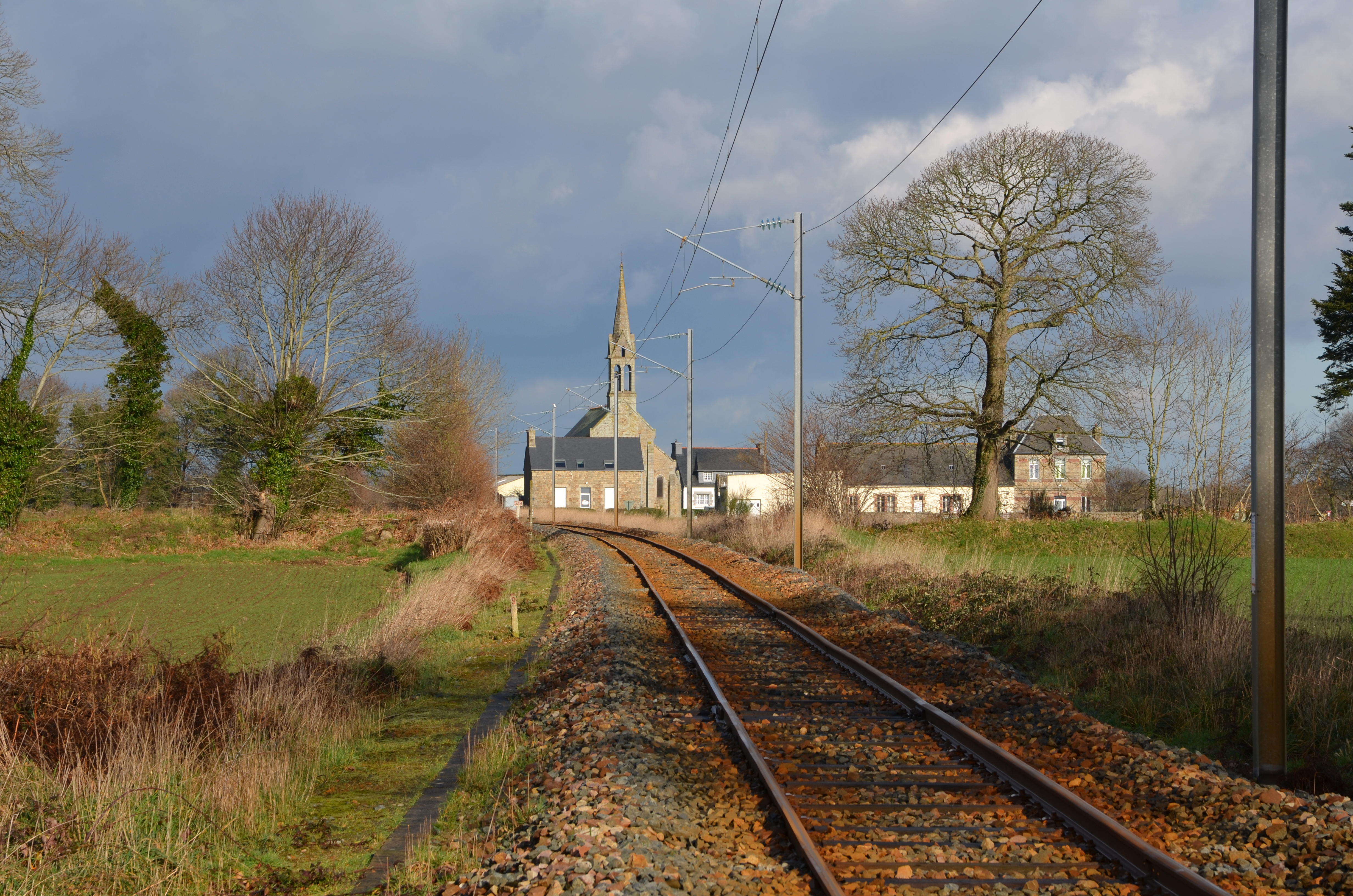 Ploubezre : écart de Kerauzern, chemin de fer, chapelle de Kergrist et école publique, vue générale sudImmatriculation