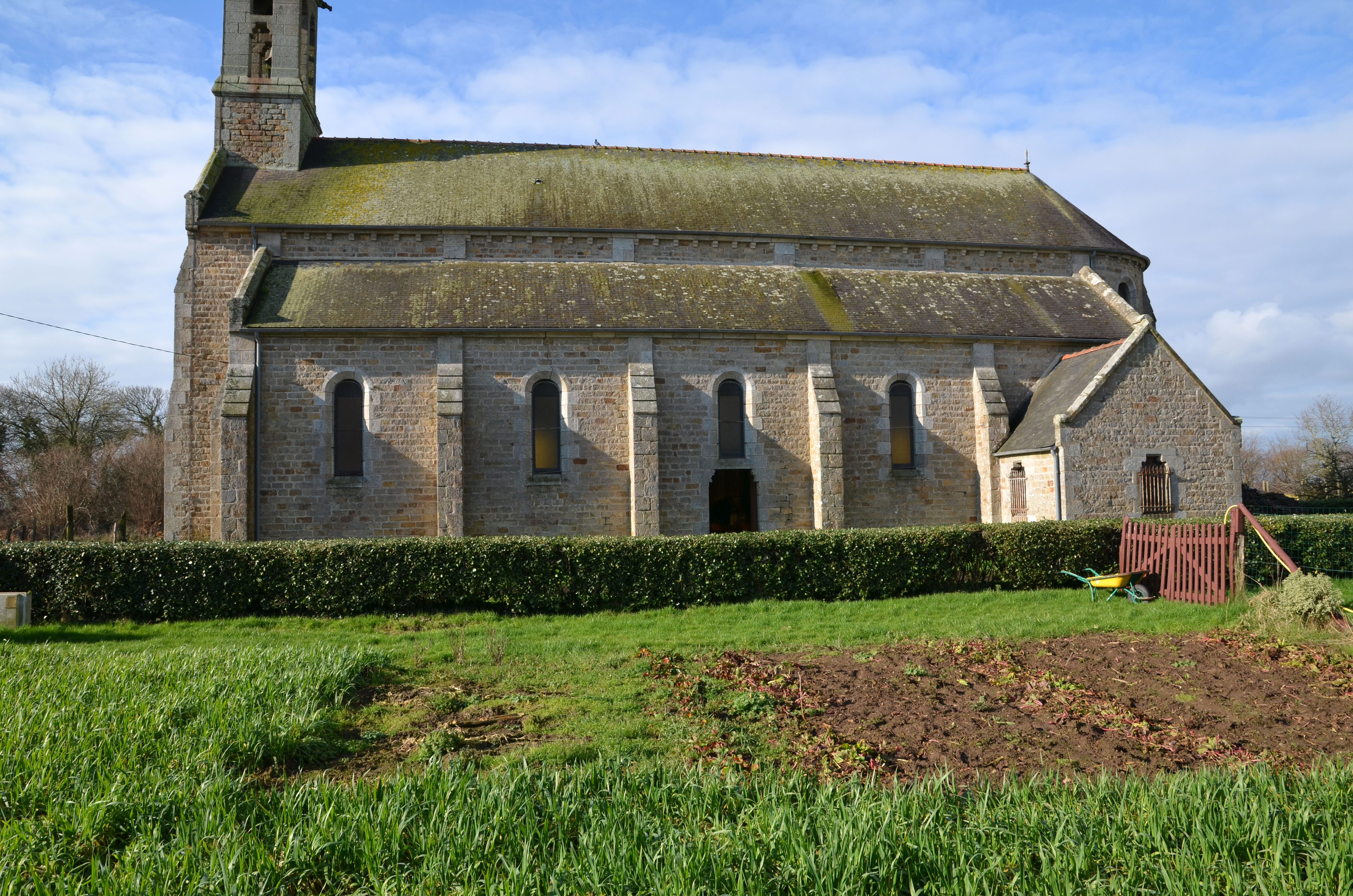 Ploubezre, Kerauzern : chapelle Notre-Dame de Kergrist, vue générale depuis l'est. Elle comprend une grande nef avec bas-cotés à cinq travées dotés de contreforts et un chevet arrondi. La petite sacristie est implantée à l'estImmatriculation