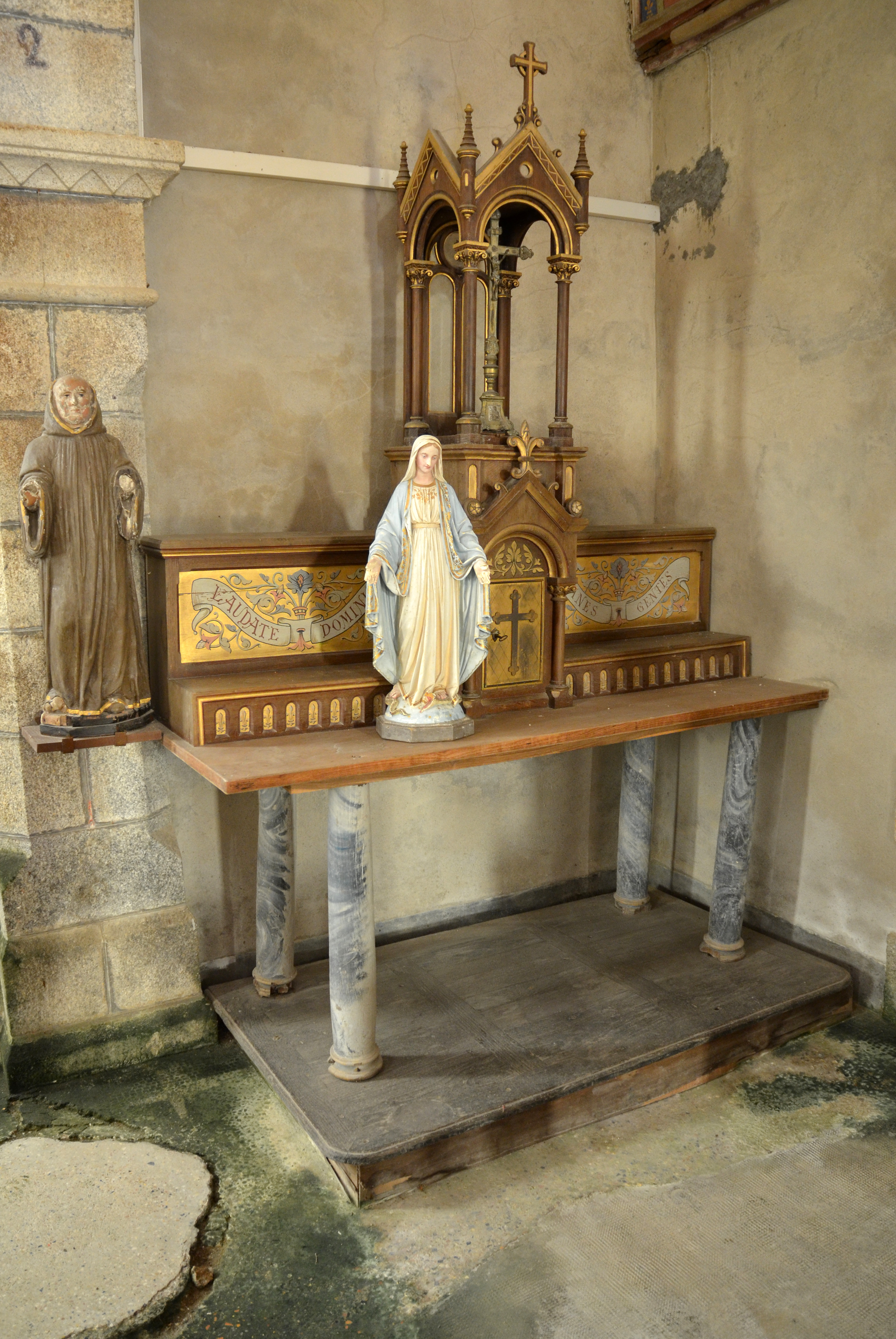 Ploubezre, Kerauzern : chapelle Notre-Dame de Kergrist, vue intérieure, retable est, statuesImmatriculation
