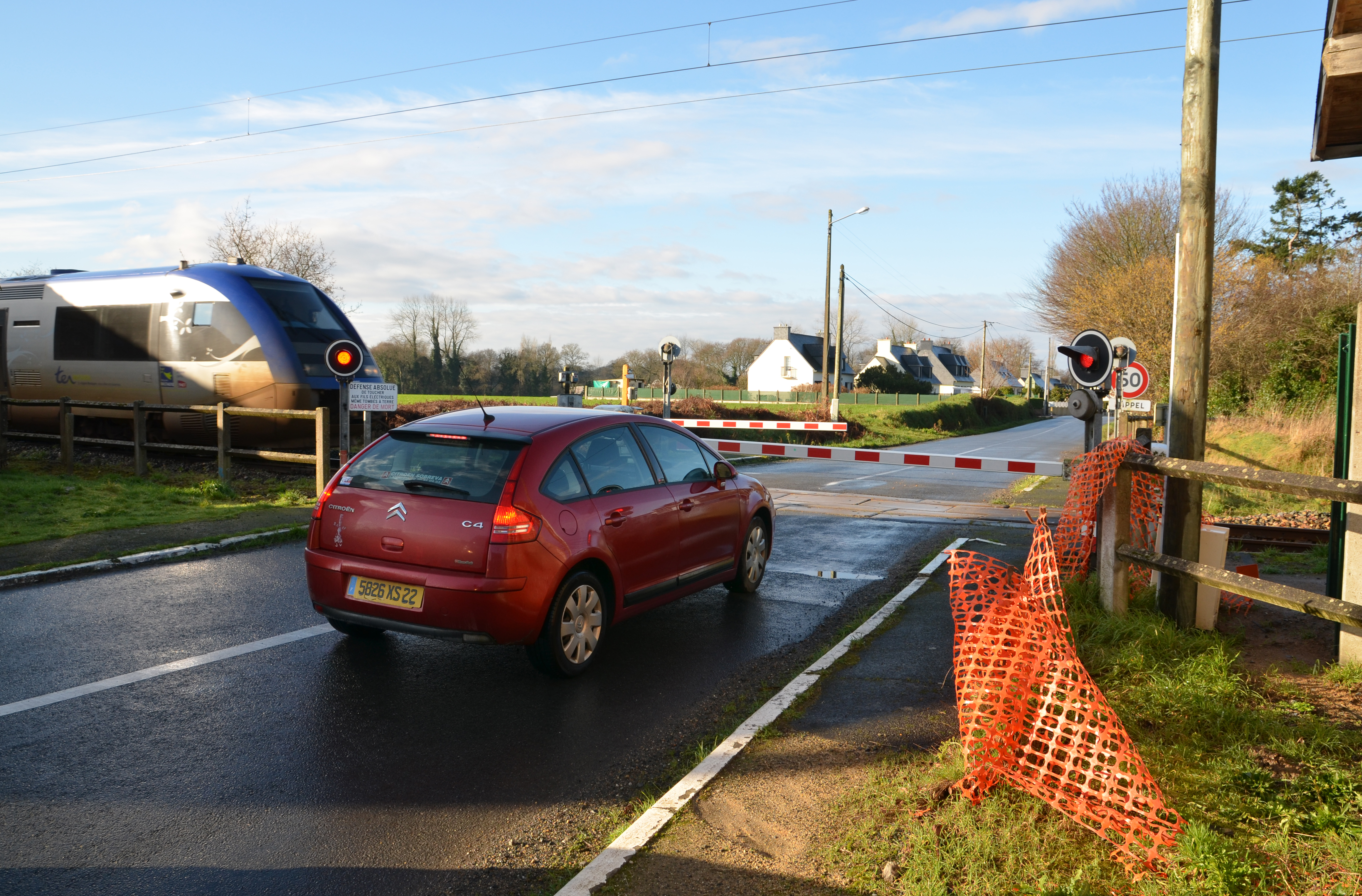 Ploubezre, Kerauzern : passage à niveau situé à côté de l'ancienne gare lors du passage d'un Transport express régional qui relie Plouaret à LannionImmatriculation