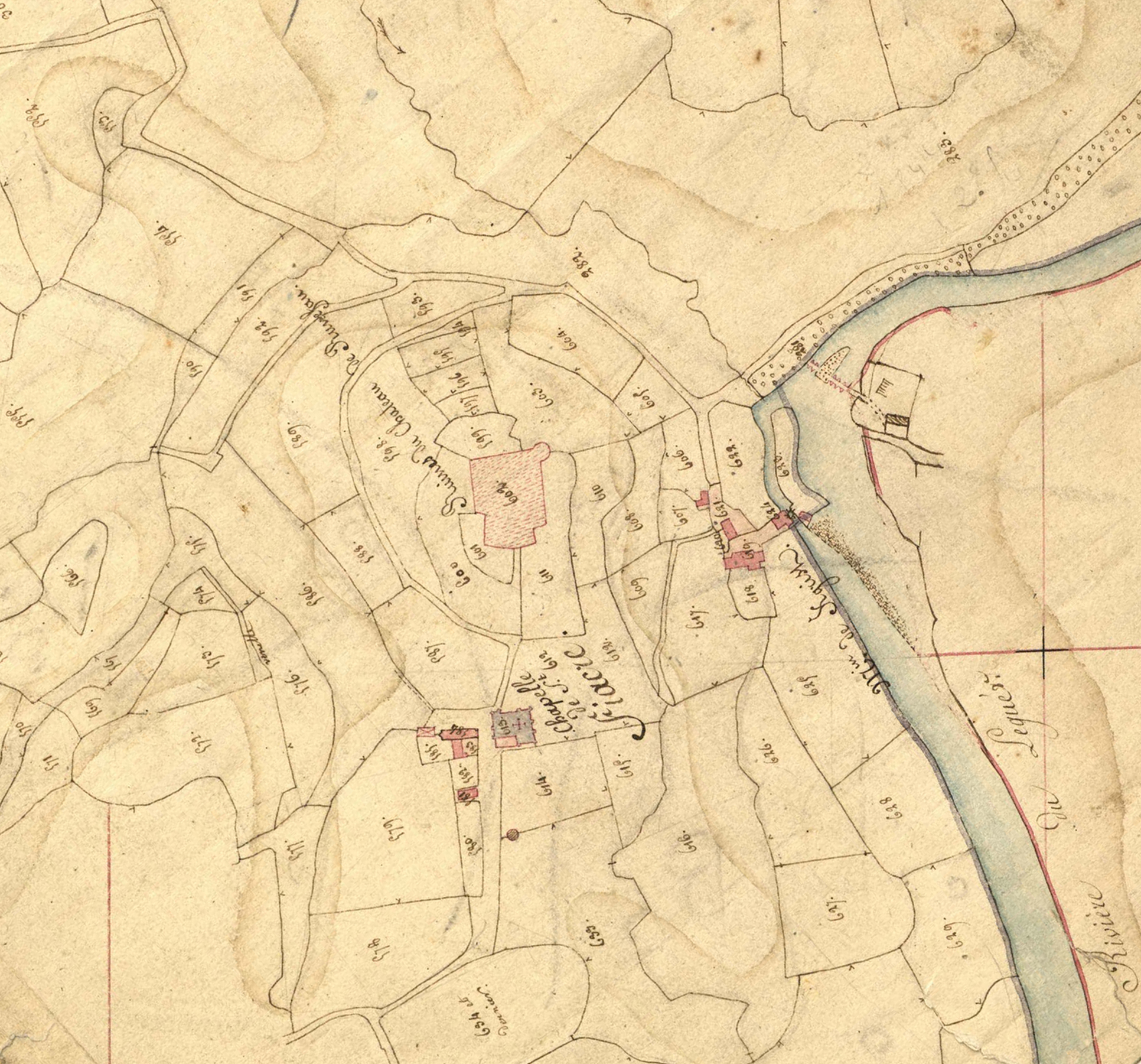 Extrait du cadastre ancien de la commune de Ploubezre, 1826 : château fort de Runfao sur les rives de LéguerImmatriculation