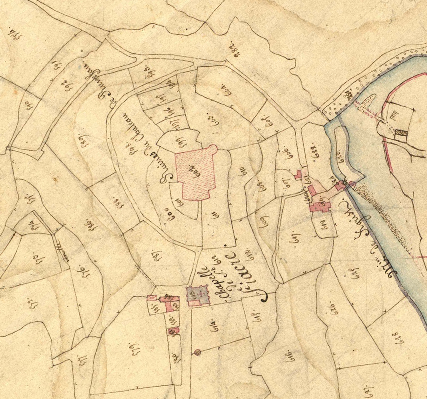 Extrait du cadastre ancien de la commune de Ploubezre, 1826 : château fort de Runfao, chapelle Saint-Fiacre et moulin de Kergrist situé sur la rive ouest de LéguerImmatriculation