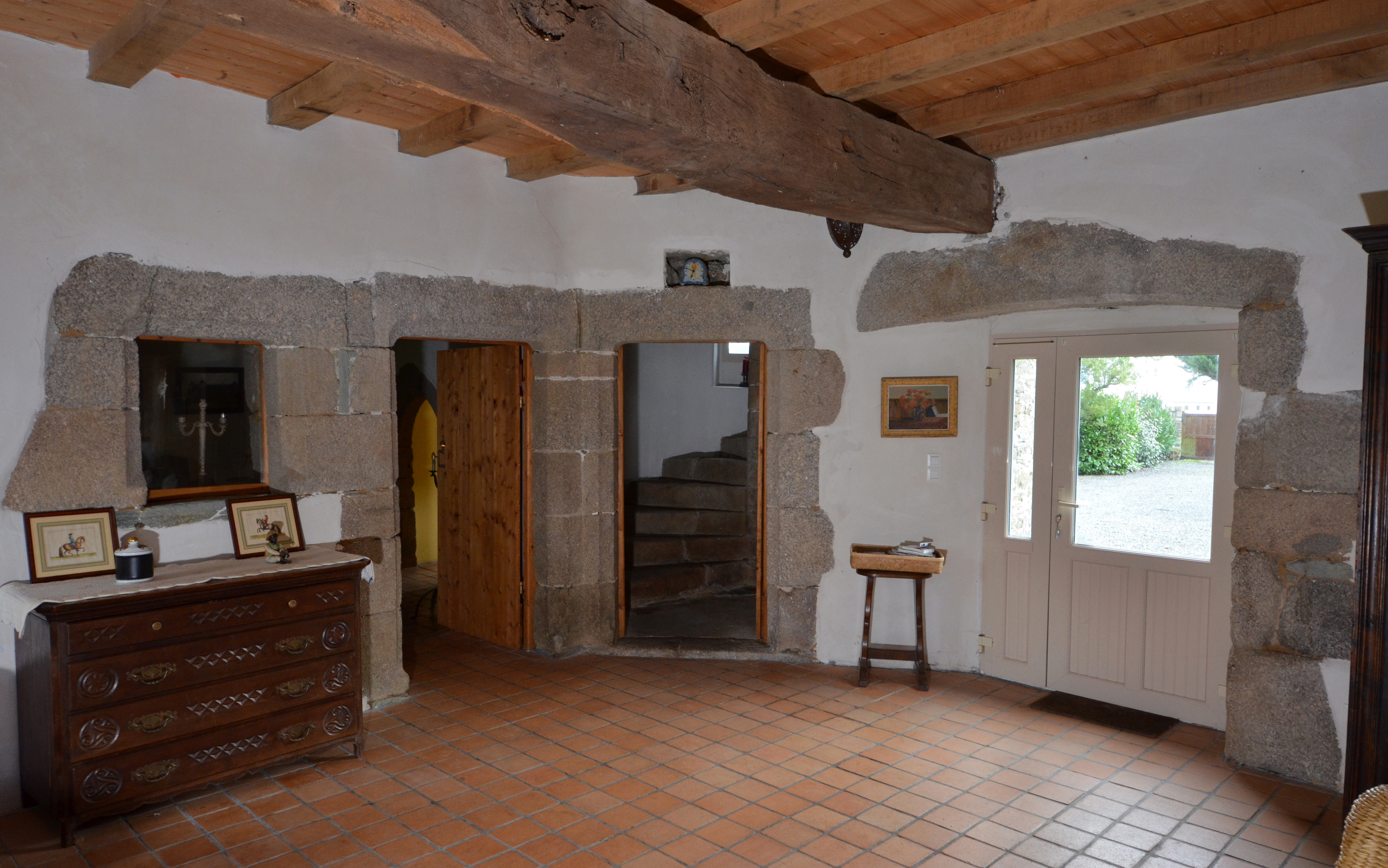 Ploubezre : manoir de Keranroux, salle basse, entrée, porte de l'escalier en vis et porte de la cuisine avec passe-platImmatriculation