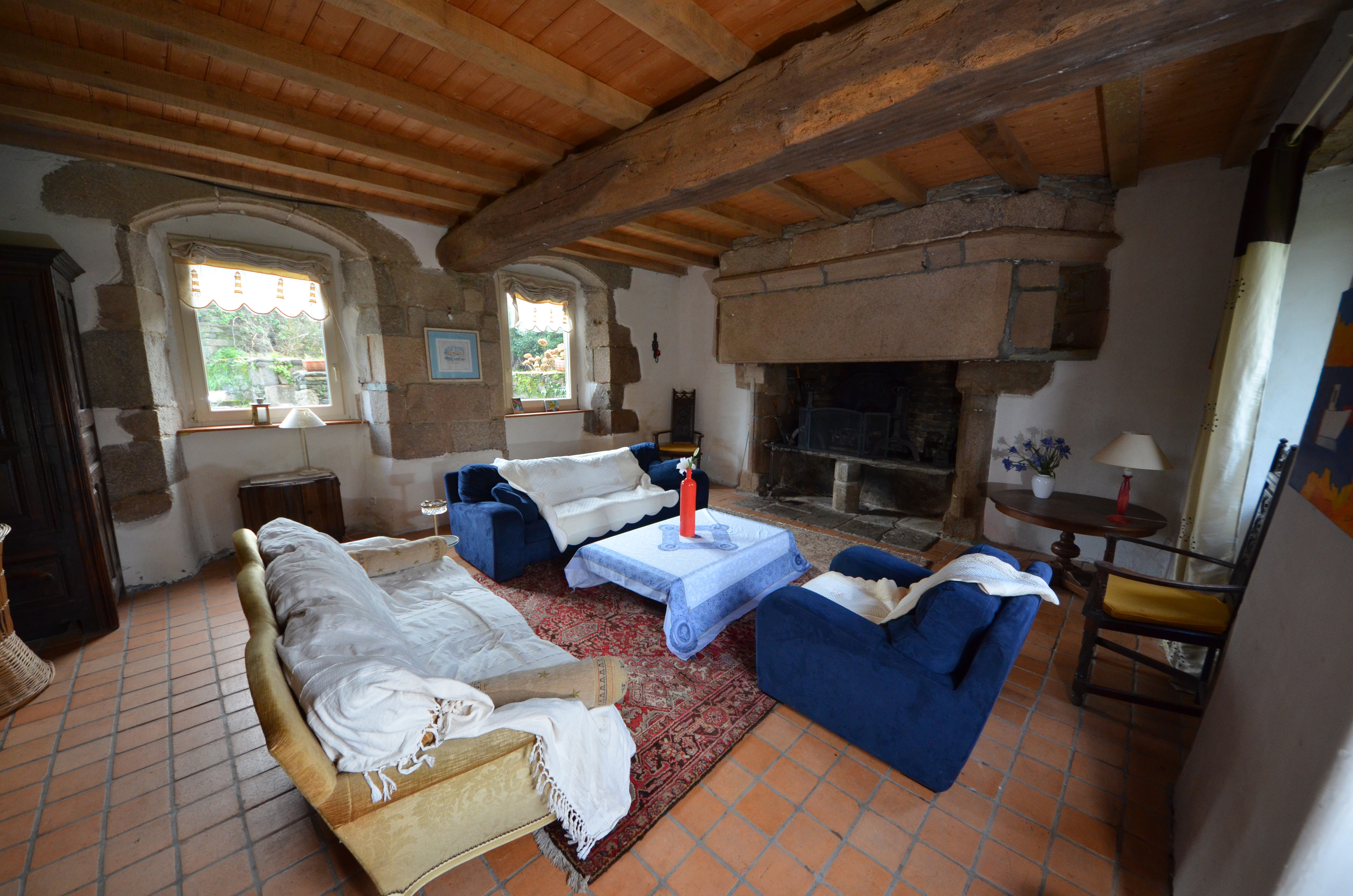 Ploubezre : manoir de Keranroux, salle basse avec fenêtres et cheminée monumentaleImmatriculation