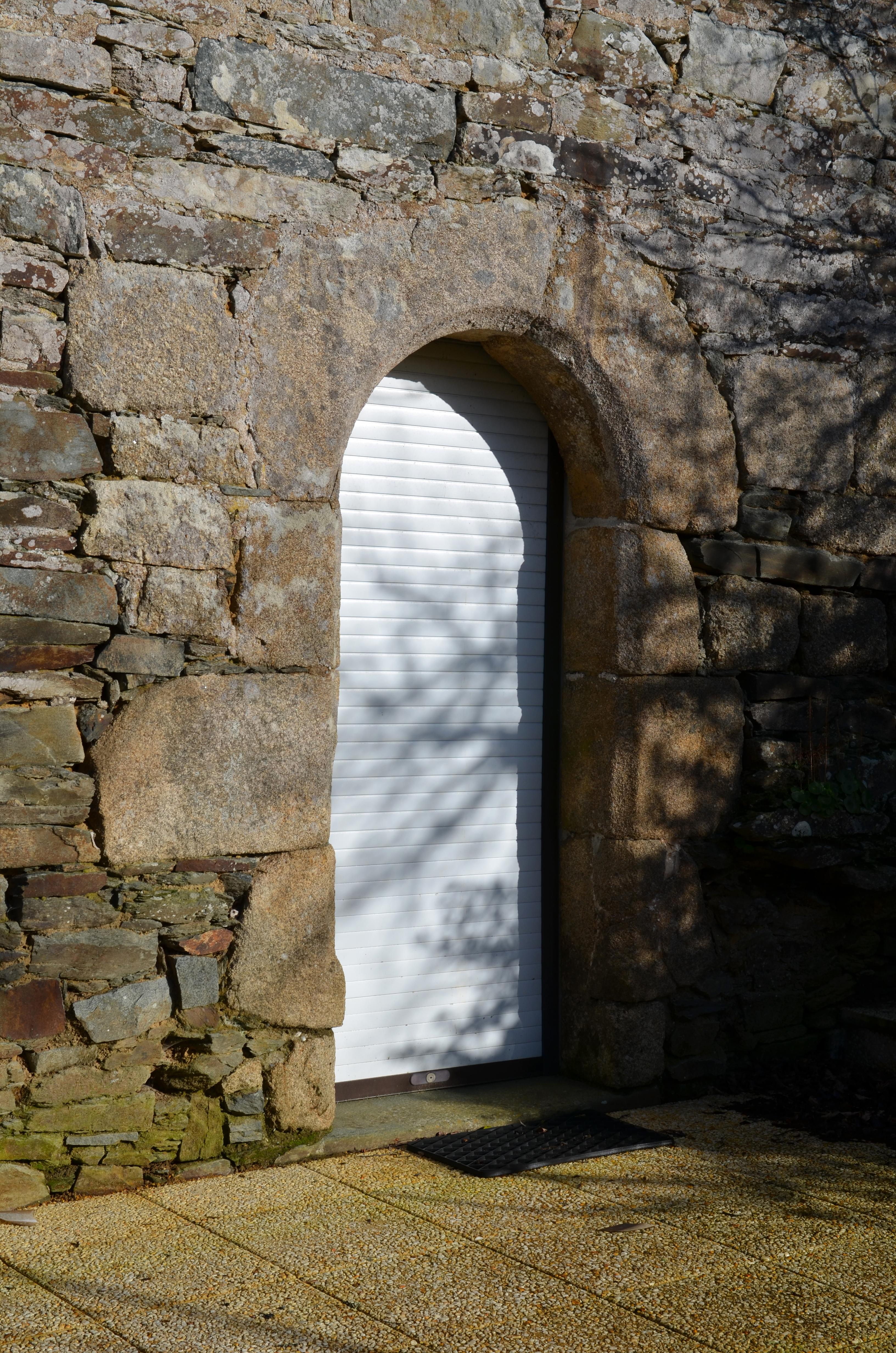 Ploubezre, Rosalic : dépendances et fuie, élévation ouest, porte en plein cintre datée 1585Immatriculation