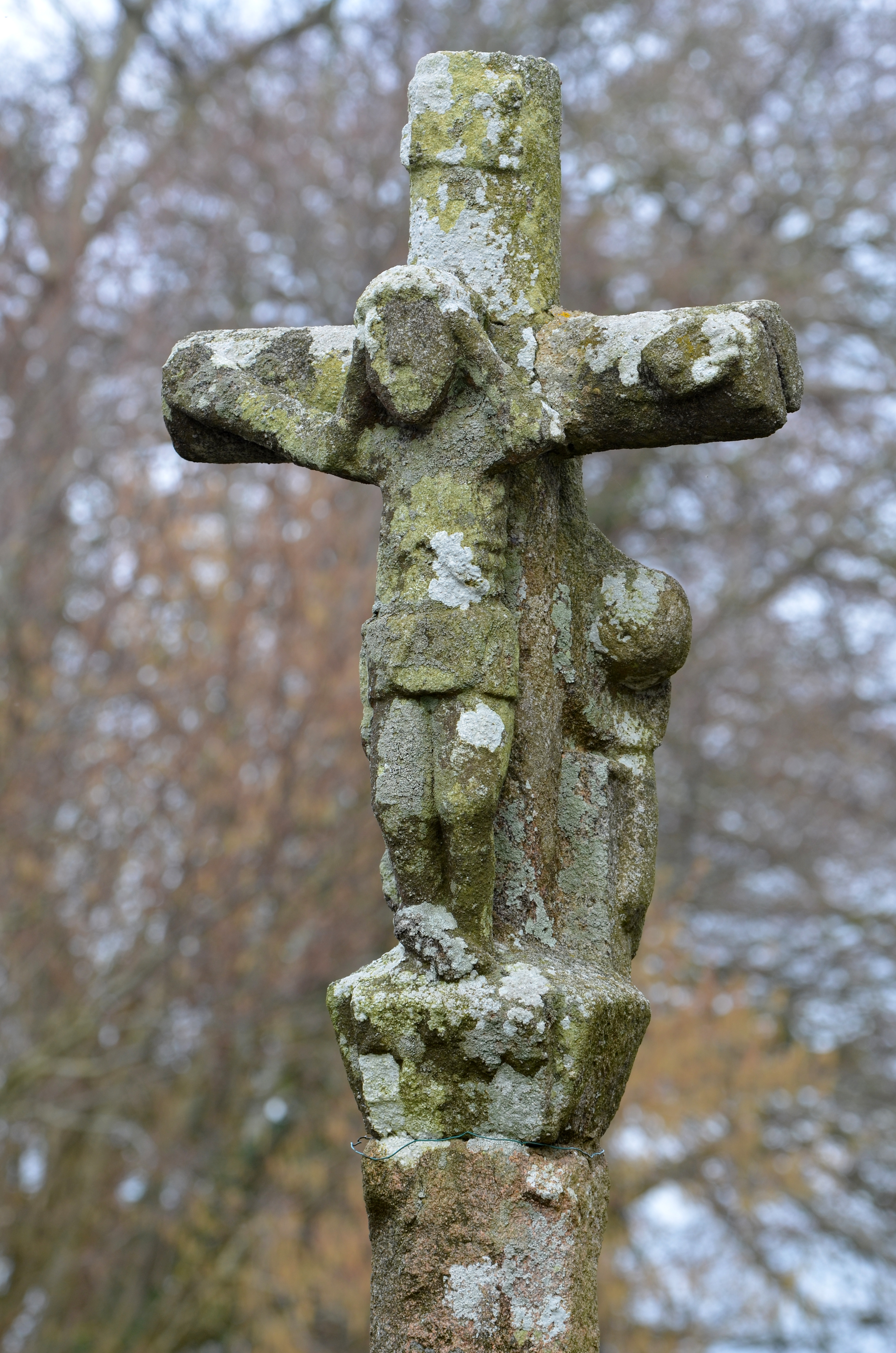 Ploubezre, Ty Croaz : croix de chemin, Christ en croix, vue de détail depuis l'ouestImmatriculation