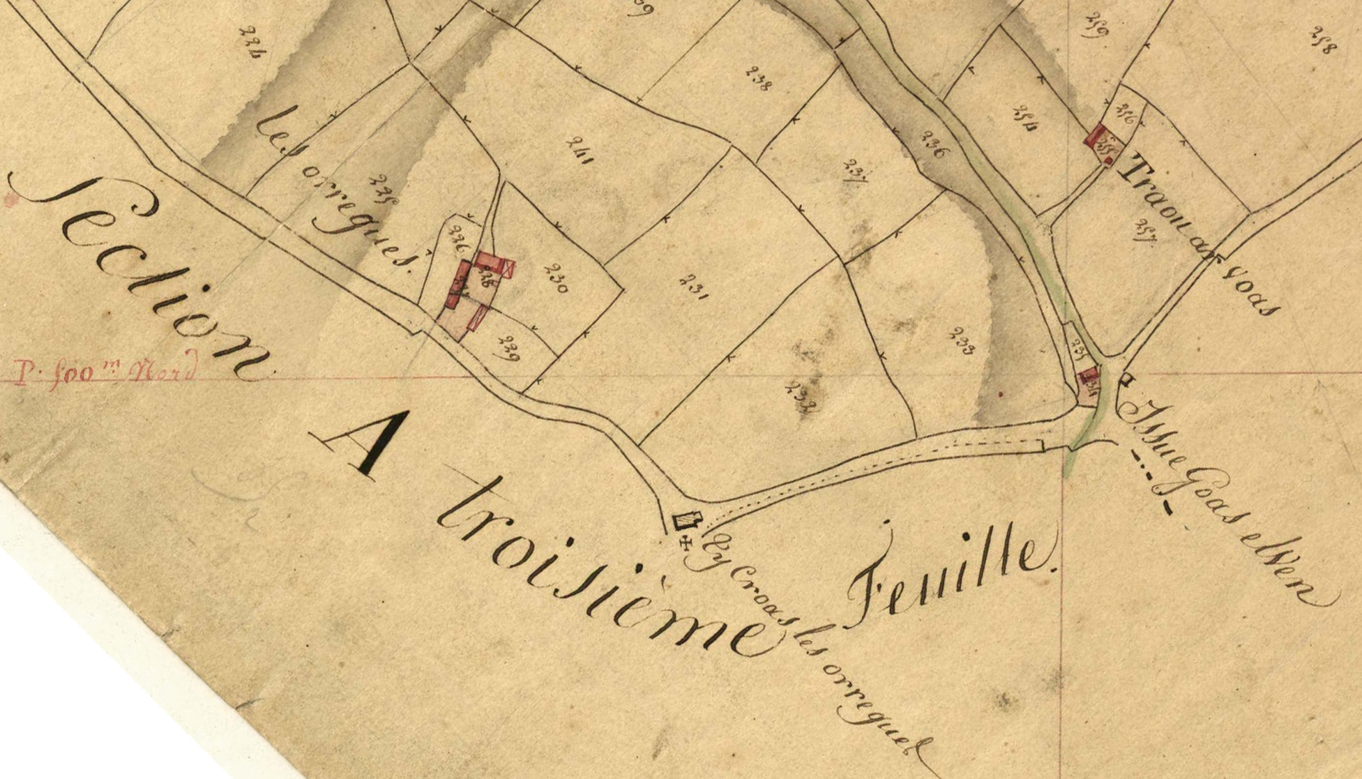 Extrait du cadastre ancien de la commune de Ploubezre, 1826 : Les Orregues, Ty Croaz les Orregues, Issue Goas Elven et Traou ar Voas [Melchonneg]Immatriculation