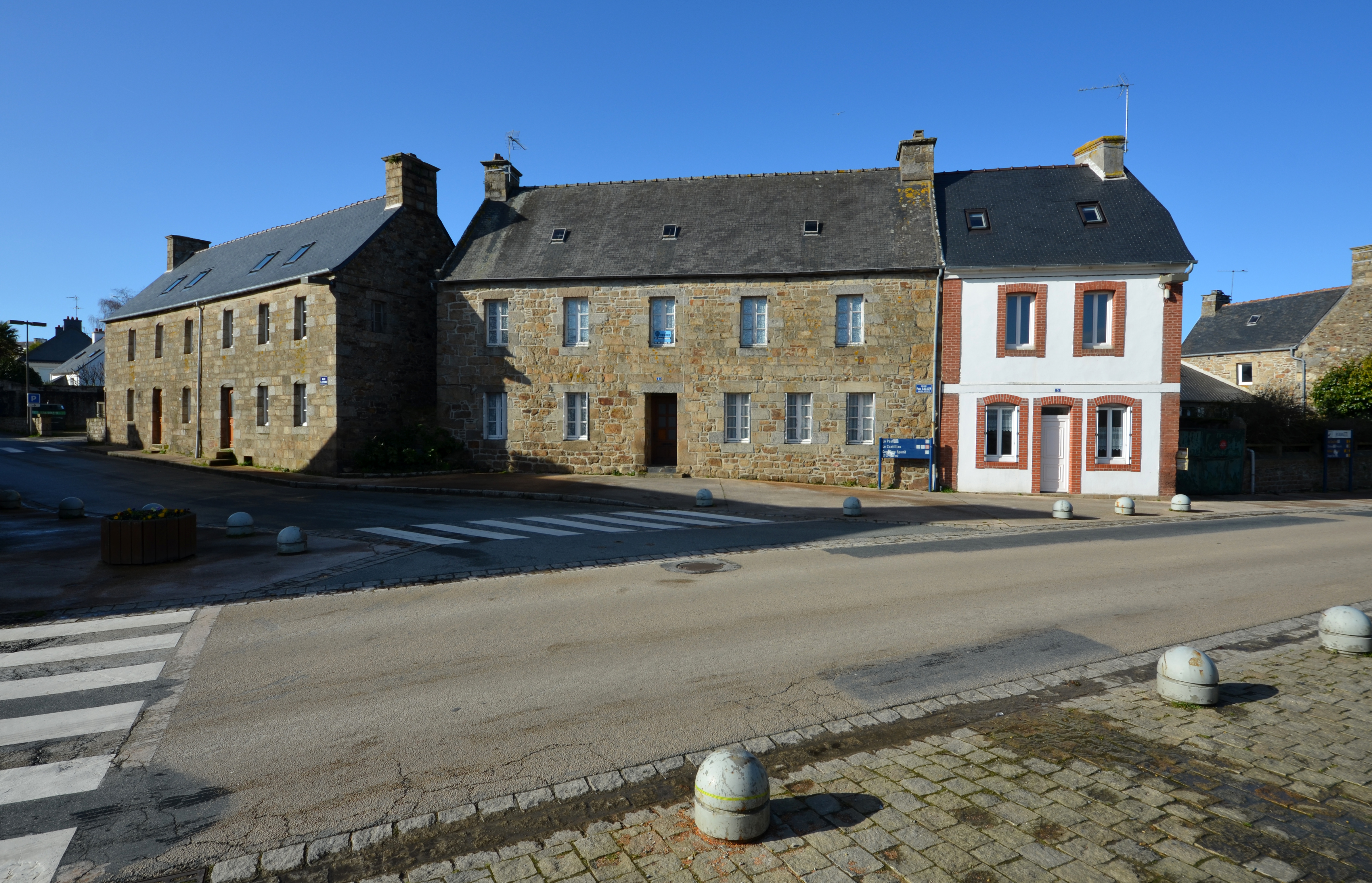 Ploubezre, le bourg, croisement des rues Yves Le Cudénnec et Paul Salaün faisant face à l'église : maisons de bourg, élévation antérieure côté rueImmatriculation