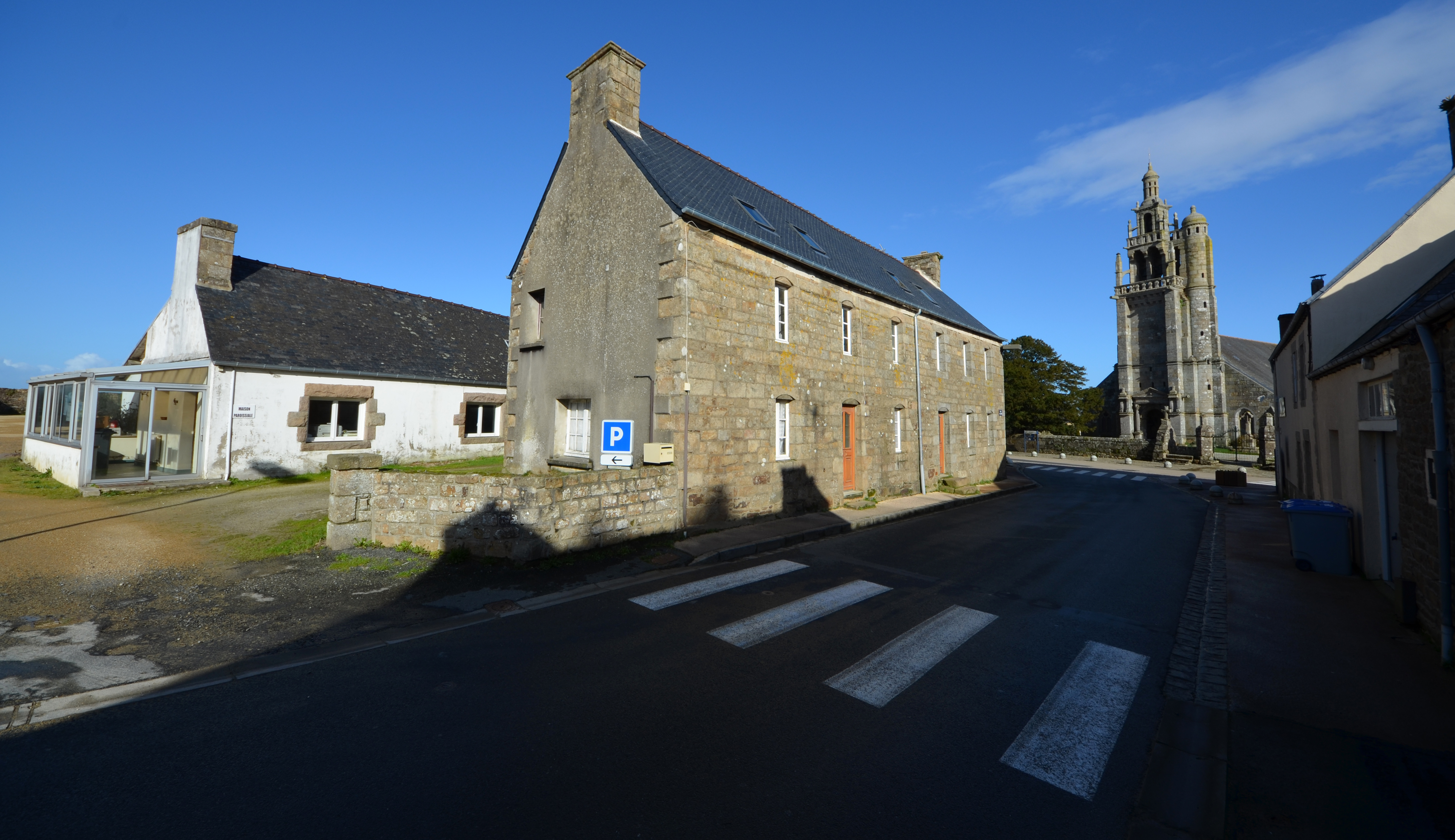 Ploubezre, le bourg, extrémité orientale de la rue Yves Le Cudénnec faisant face à l'église : maison de bourg, élévation antérieure côté rue. Elle est datable du 1er quart du 19e siècle (inscriptions non lisibles)Immatriculation