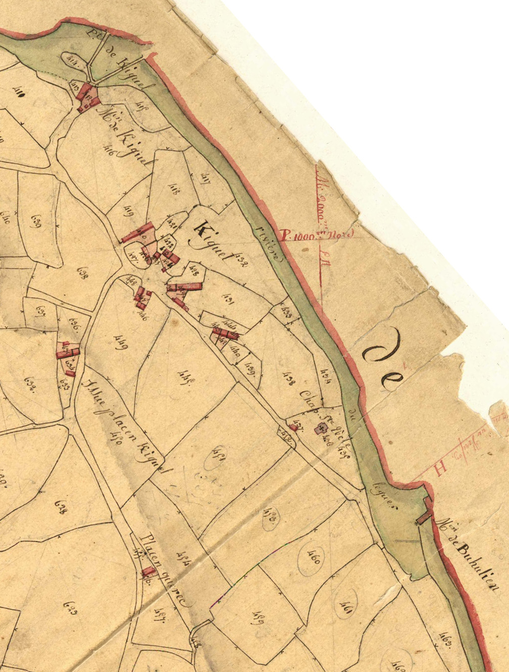 Extrait du cadastre ancien de la commune de Ploubezre, 1826 : Pont de Keriguel, Moulin de Keriguel, Keriguel, chapelle Sainte-Thècle, Issue Placen Keriguel, Placen Querec, Moulin de Buhulien, aujourd'hui écart de Keriel (rive occidentale du Léguer)Immatriculation