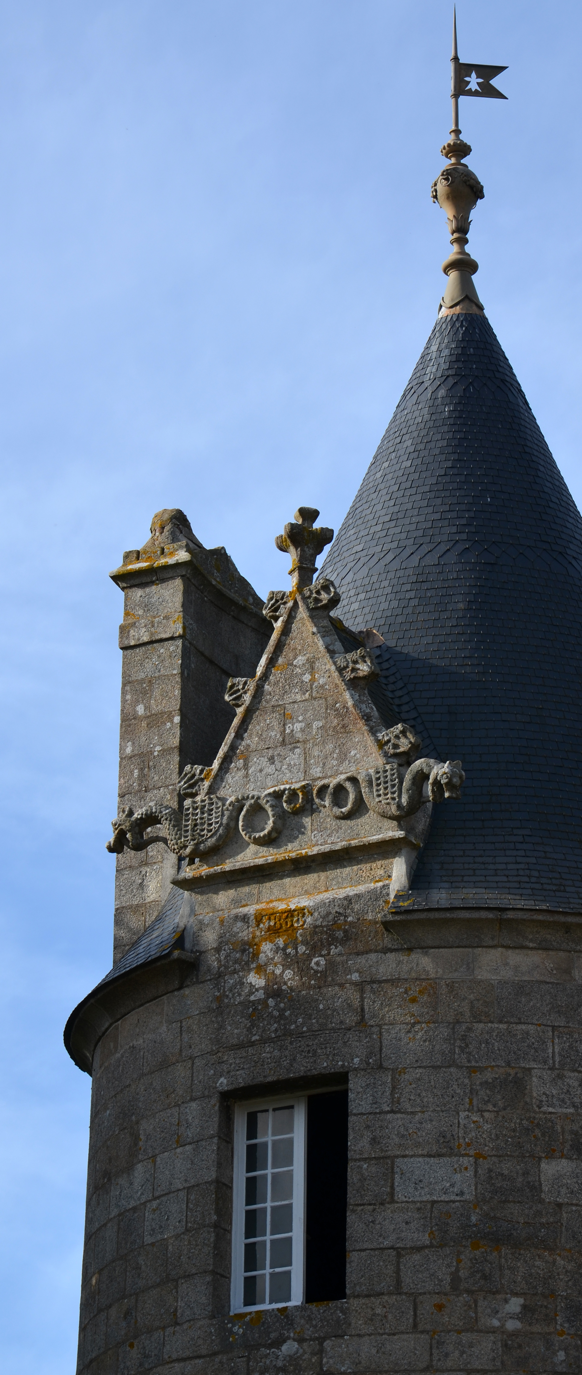 Ploubezre : château de Kergrist, vue depuis le sud, détail de la lucarne de la tour sud-ouest. Elle porte le millésime 1868Immatriculation