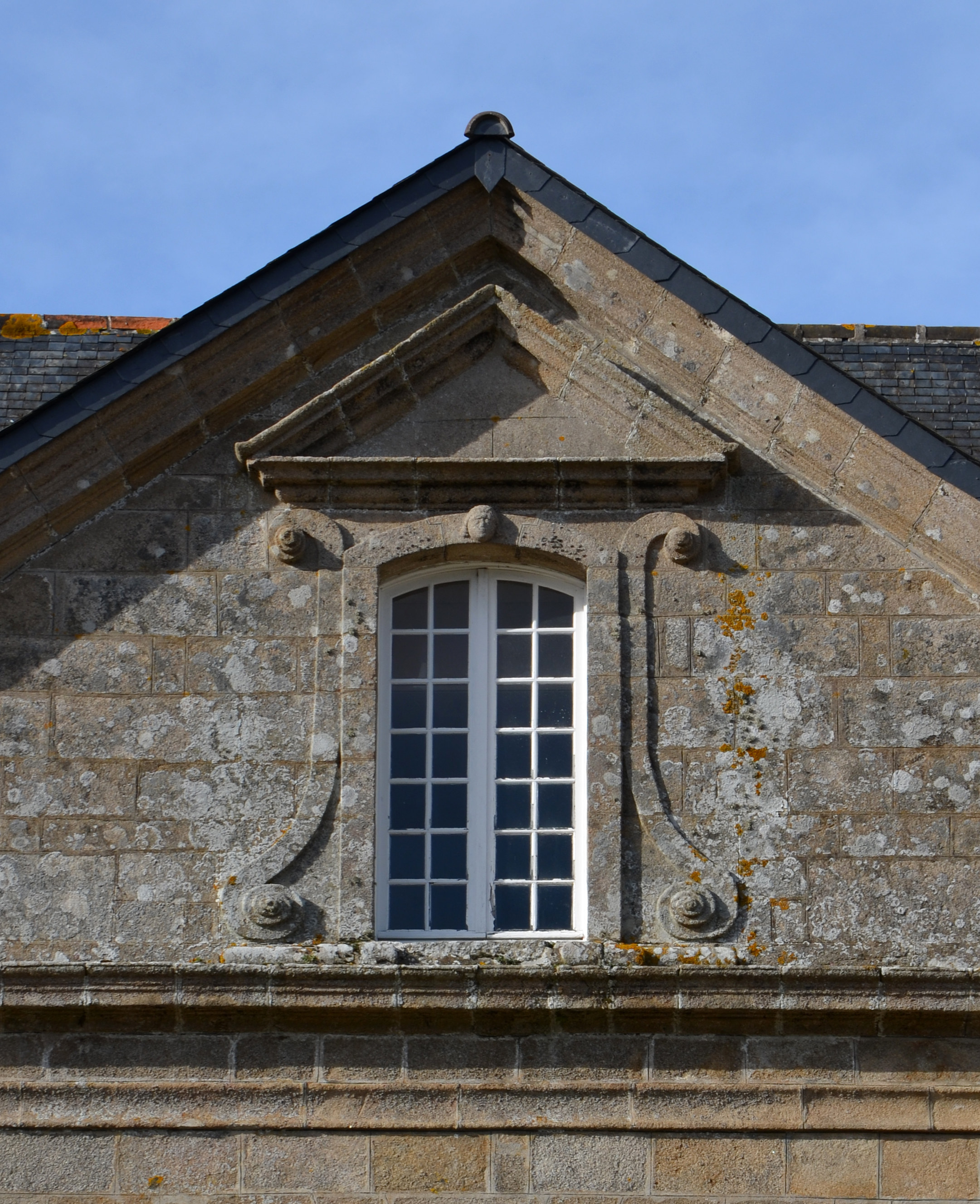 Ploubezre : château de Kergrist, vue depuis le sud, détail de l'avant-corps central surmonté d'un fronton triangulaire, fenêtre centraleImmatriculation