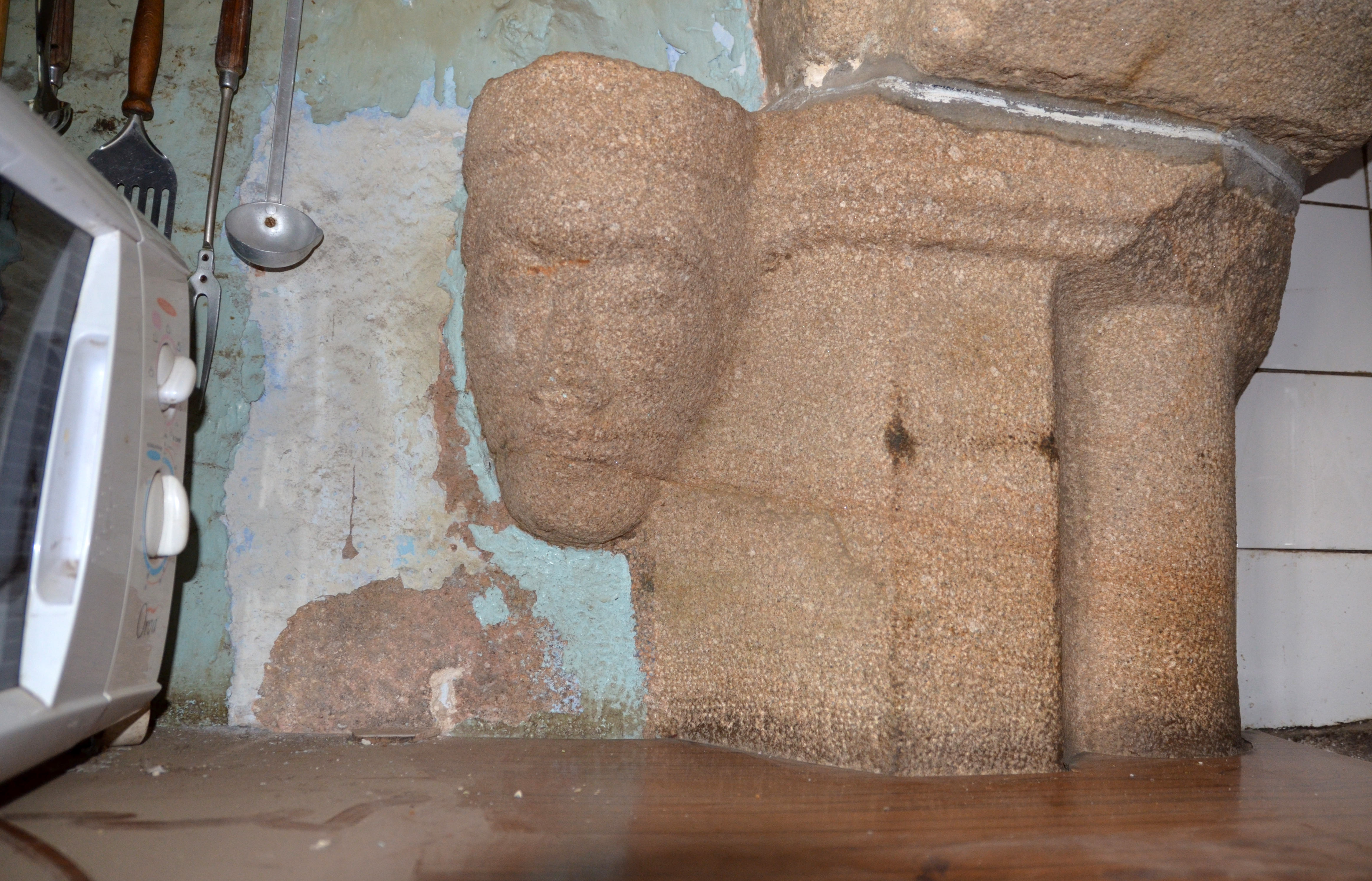 Ploubezre, Le Guirec (au nord), Convenant Le Flem : logis de ferme vraisemblablement datable du 2e quart du 19e siècle, détail de l'ornementation de la cheminée, tête humaine. Il s'agit d'un remploi datable du 15e ou 16e siècleImmatriculation