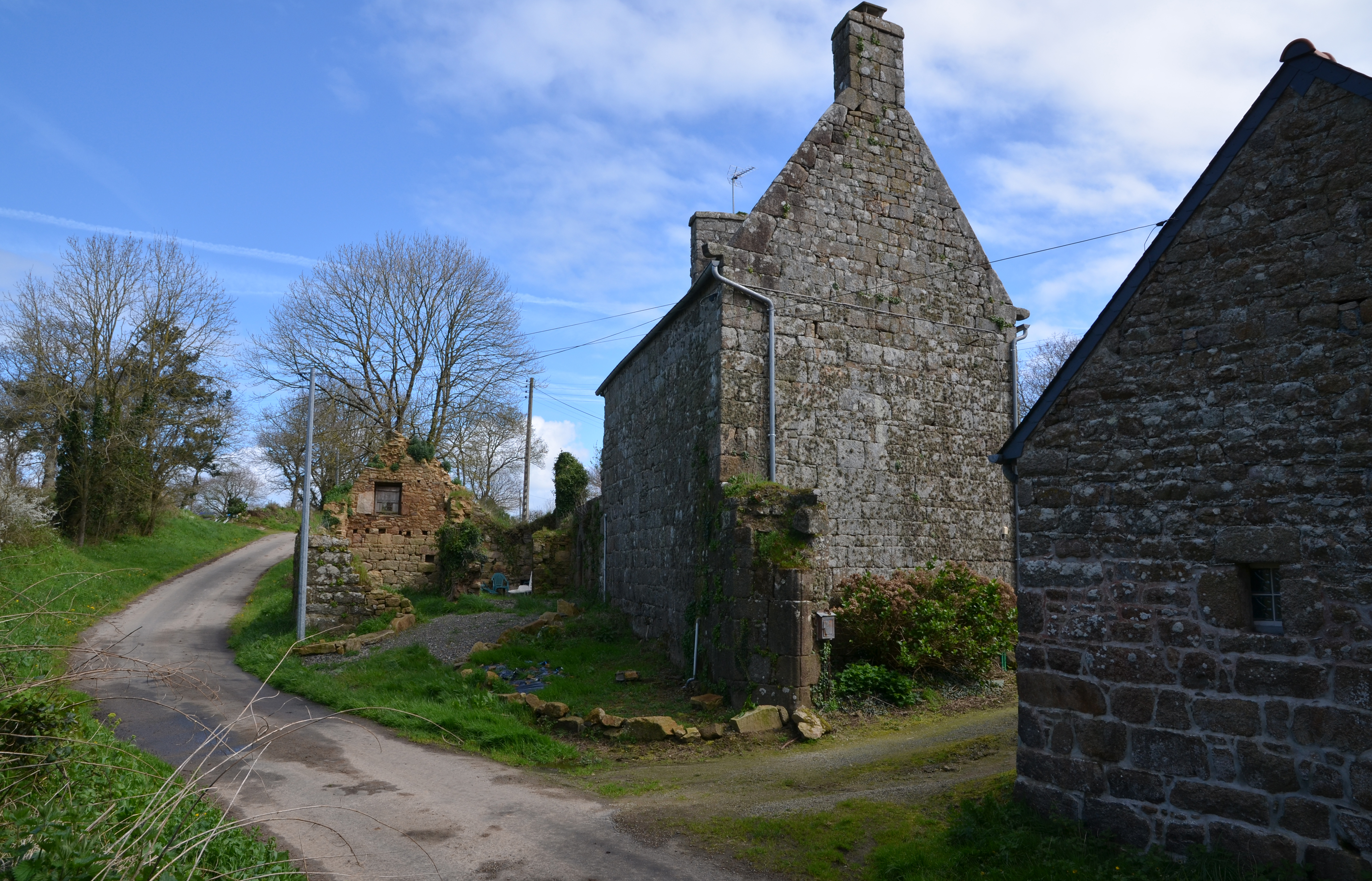 Ploubezre, Keraël : alignement de deux logis, vue générale depuis le sud. On distingue le piédroit d'une porte piétonne et probablement charretière...Immatriculation