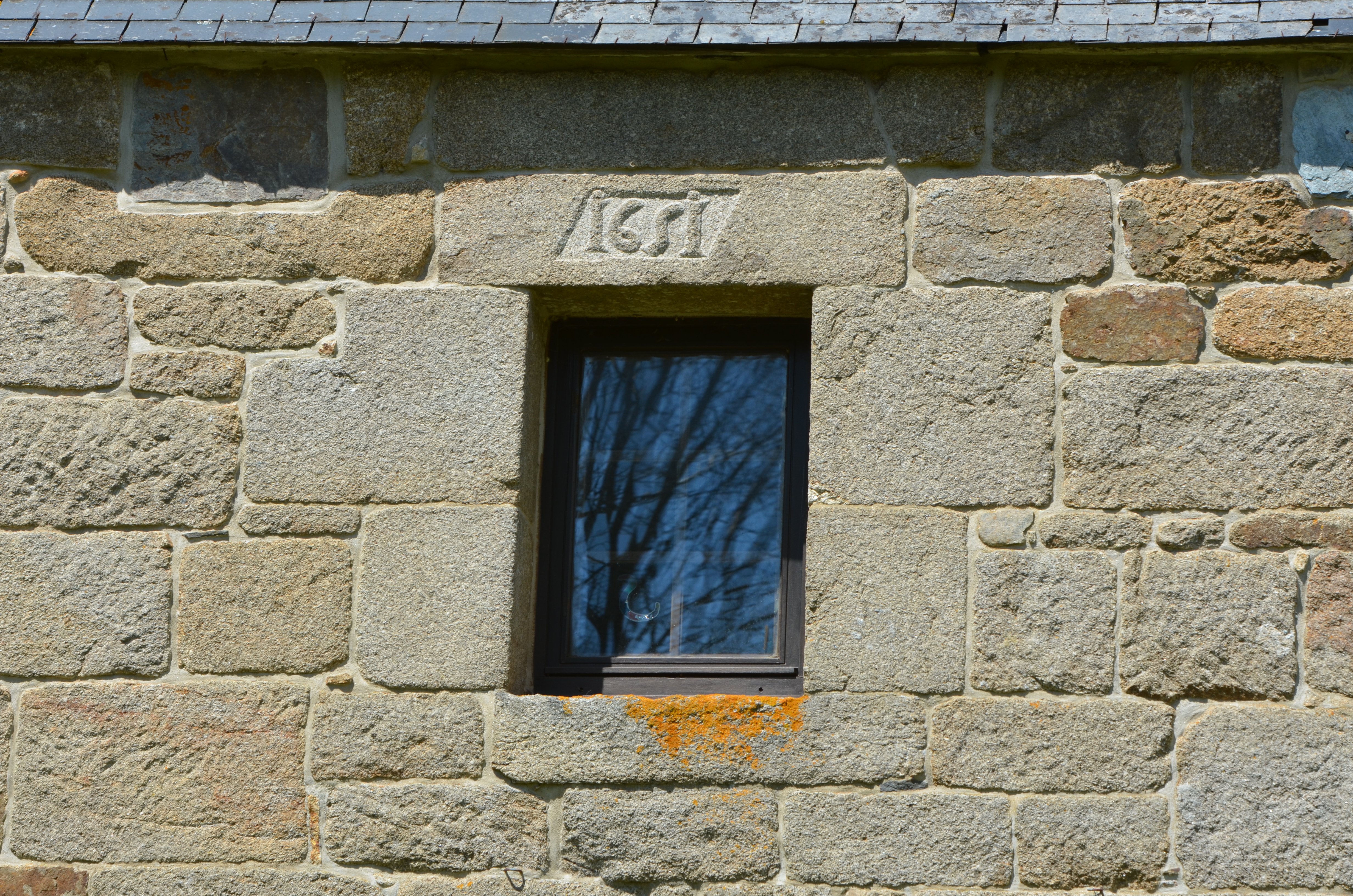Ploubezre, Kericoul : logis de ferme daté par millésime de 1651, élévation antérieure orientée vers le sud-est, détail de la fenêtre à linteau droit portant le millésimeImmatriculation
