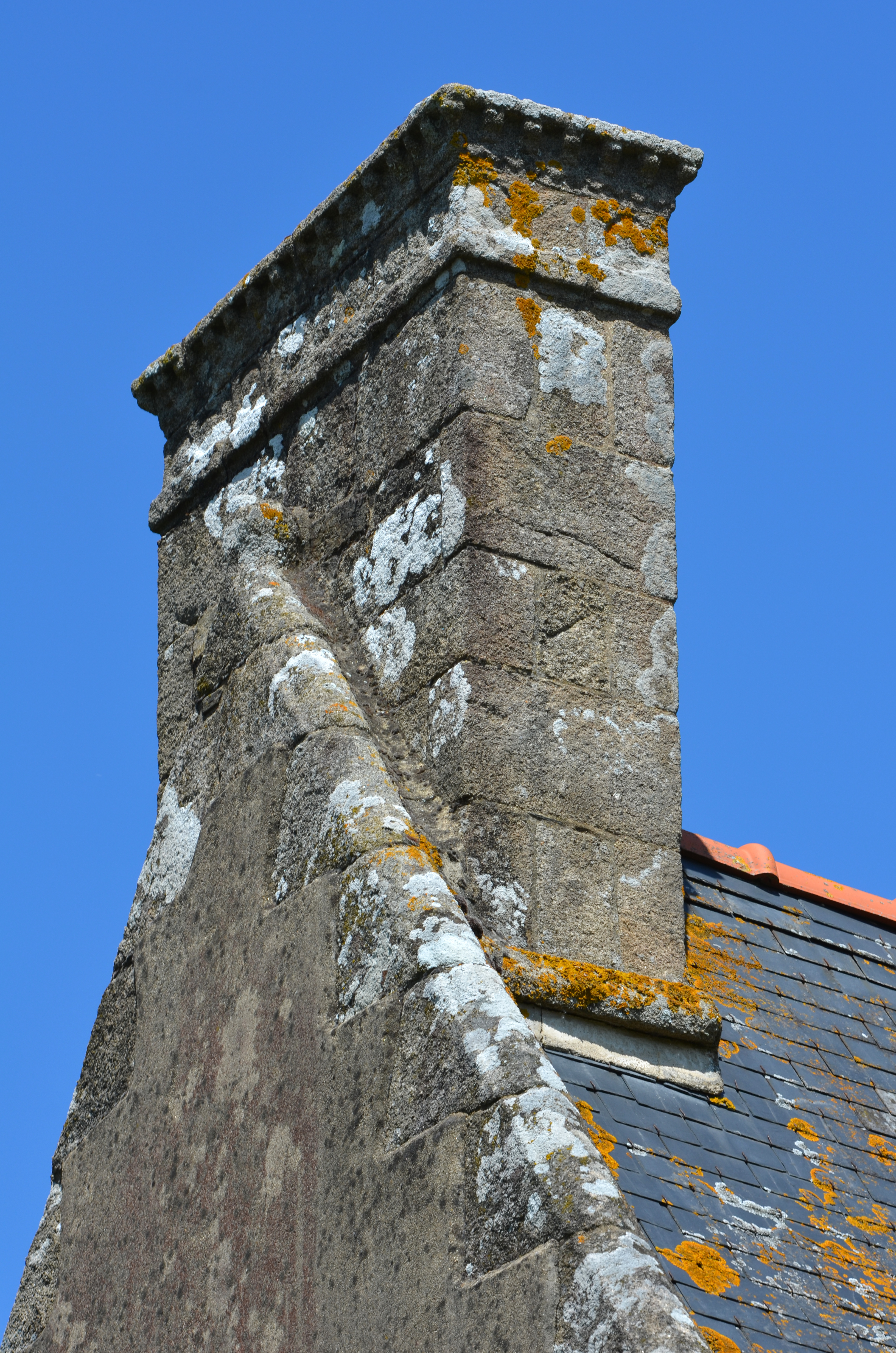 Ploubezre, Kericoul : logis de ferme daté par millésime de 1651, détail de la souche de cheminée ouest. L'ornementation traduit la richesse du commanditaireImmatriculation