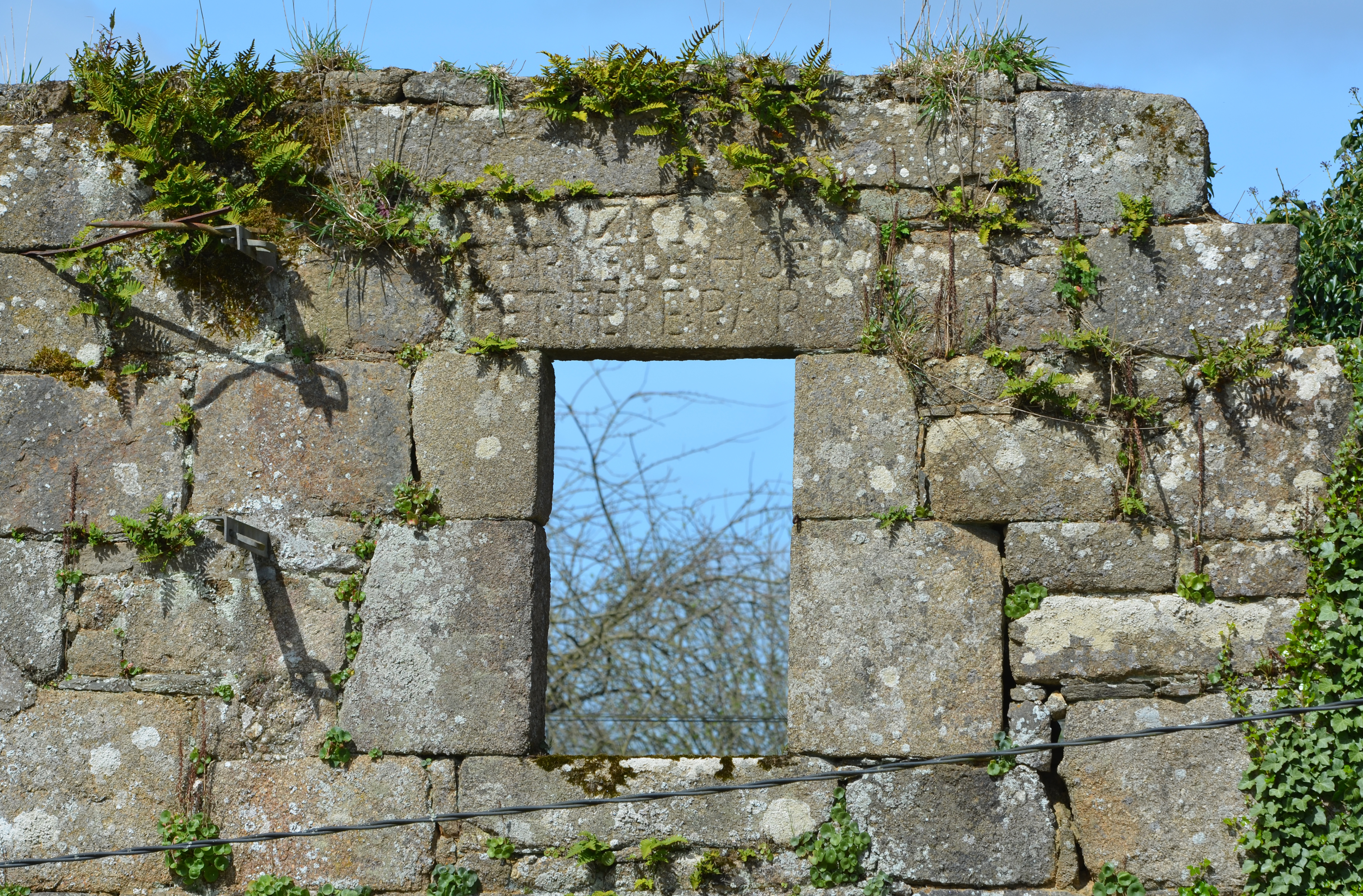 Ploubezre, Keraël : alignement de deux logis, élévation antérieure orientée vers le sud-est. Fenêtre de l'avancée du logis est ; elle est datée par millésime de 1715 et porte l'inscription "_ LE:HOER _"Immatriculation