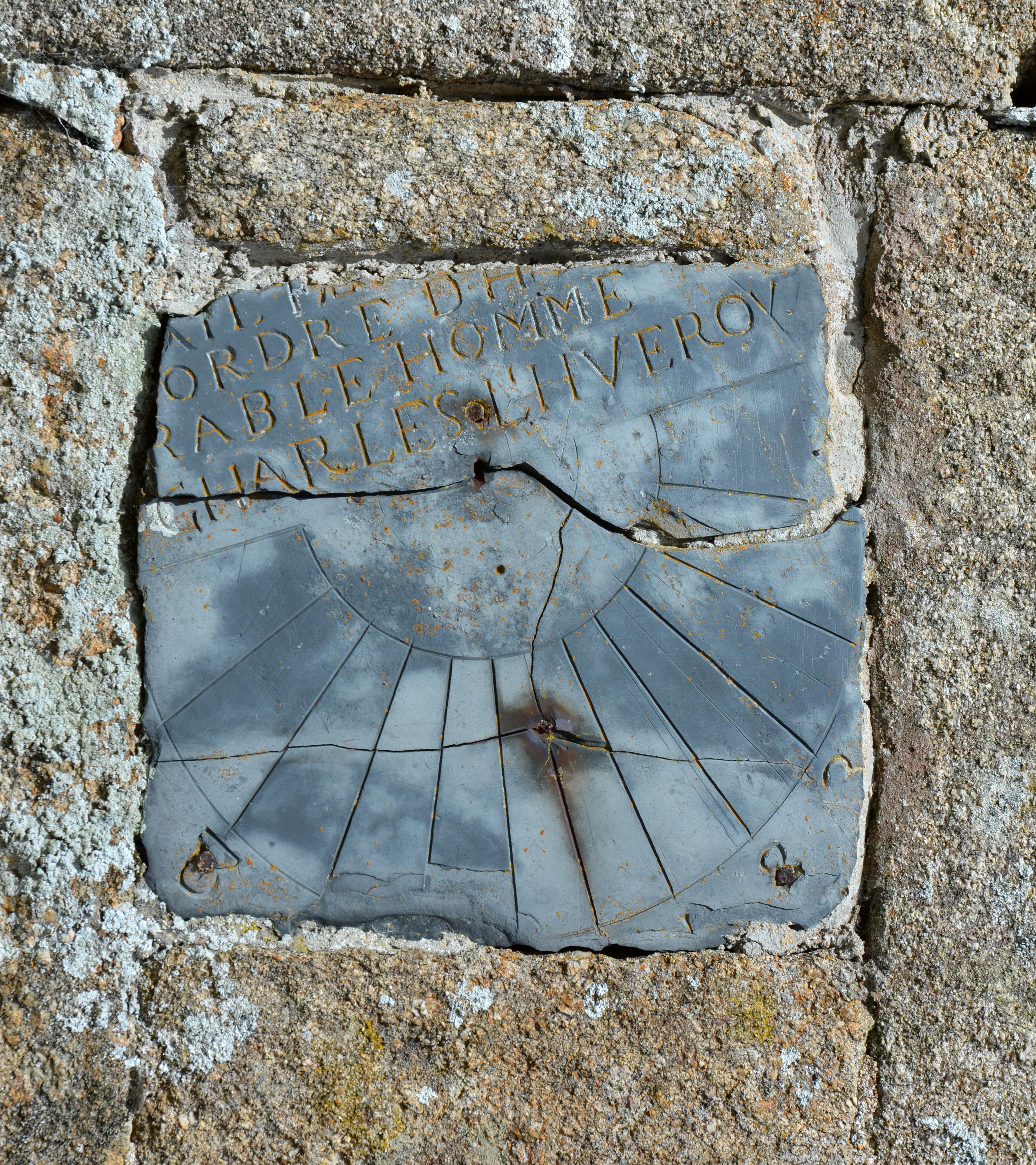 Ploubezre, Keraël : alignement de deux logis, élévation antérieure orientée vers le sud-est, vestiges d'un cadran solaire. On peut lire l'inscription suivante : "_ ORDRE DH_ _ [VENE]RABLE HOMME / CHARLES L'HVEROU"Immatriculation