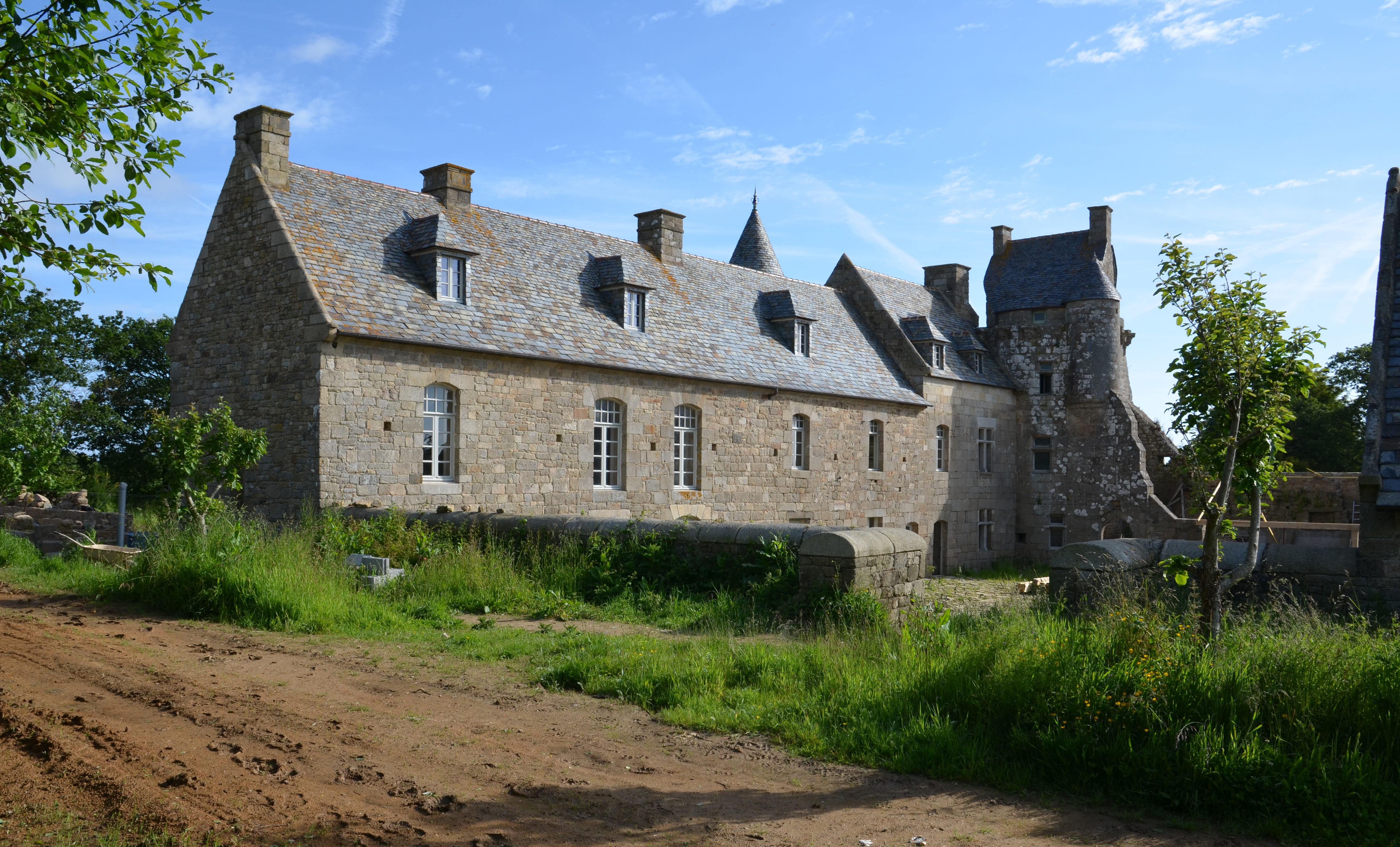 Ploubezre : manoir de Kerhervé, vue générale depuis le ouest-sud-ouest, élévation antérieure du grand logisImmatriculation