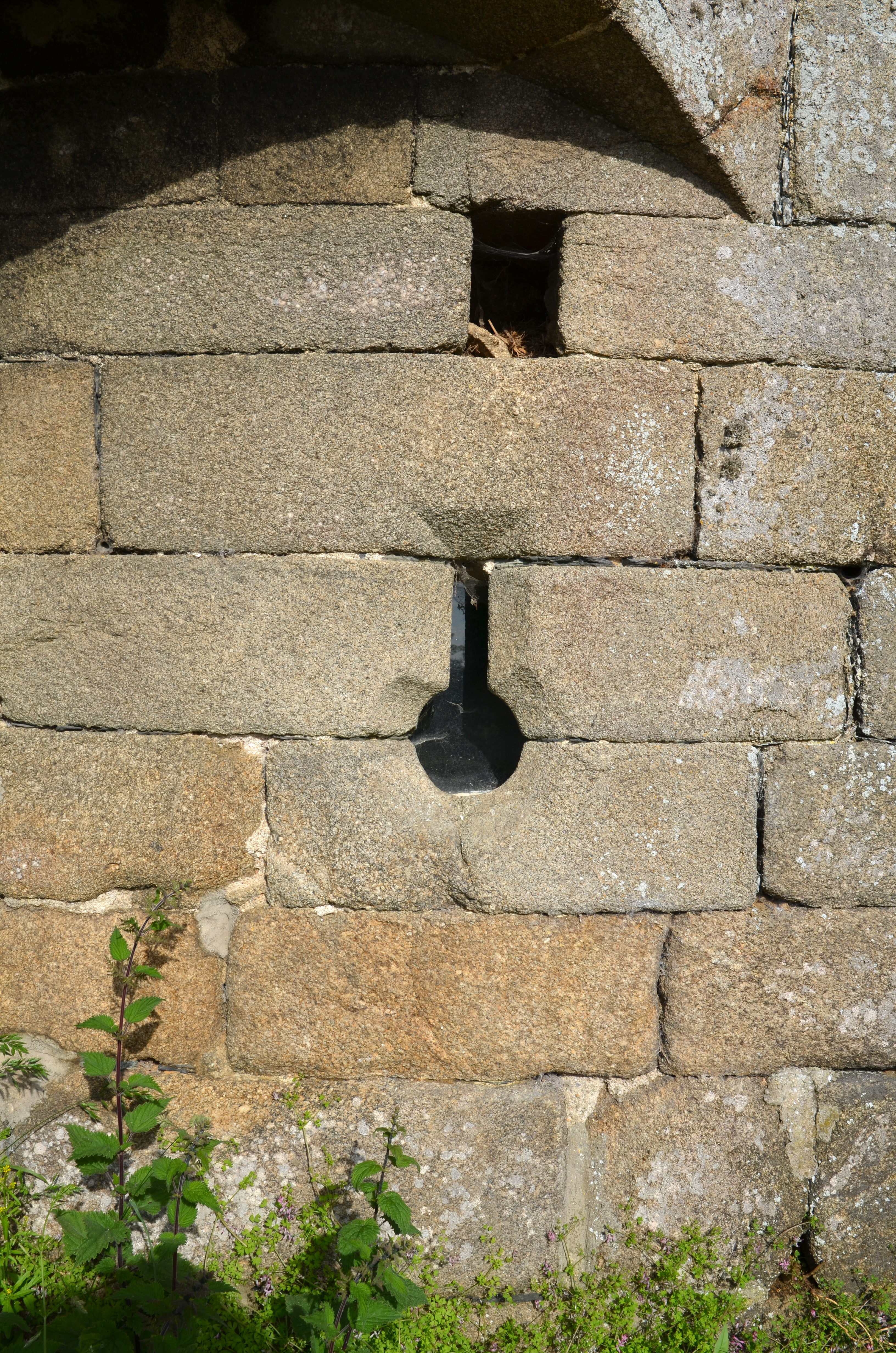 Ploubezre : manoir de Kerhervé, tour, vue de détail de l'ouverture de tir flanquant la porteImmatriculation