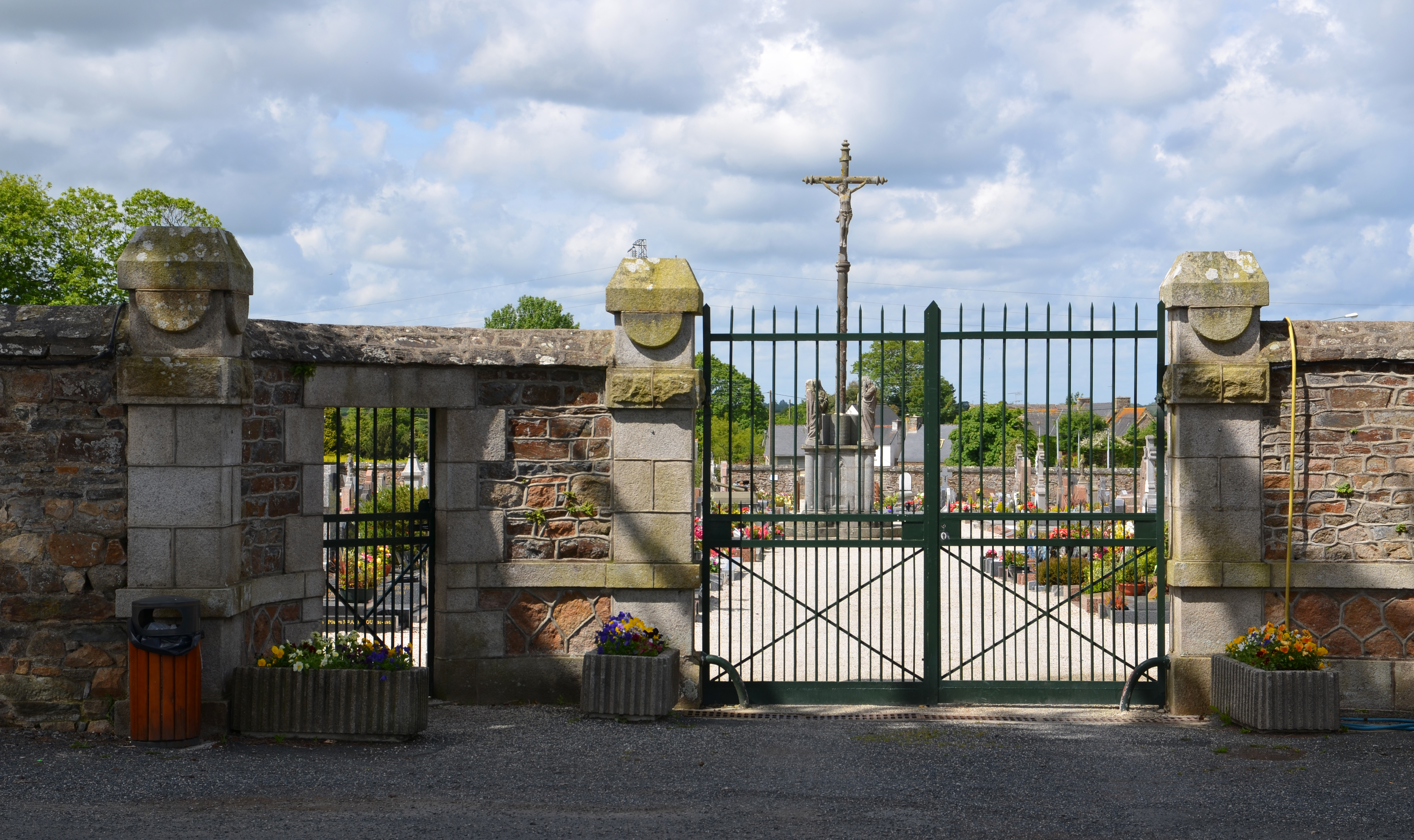 Ploubezre, le cimetière : vue de situation de la croix de mission dite "Calvaire du cimetière" depuis l'est-nord-estImmatriculation