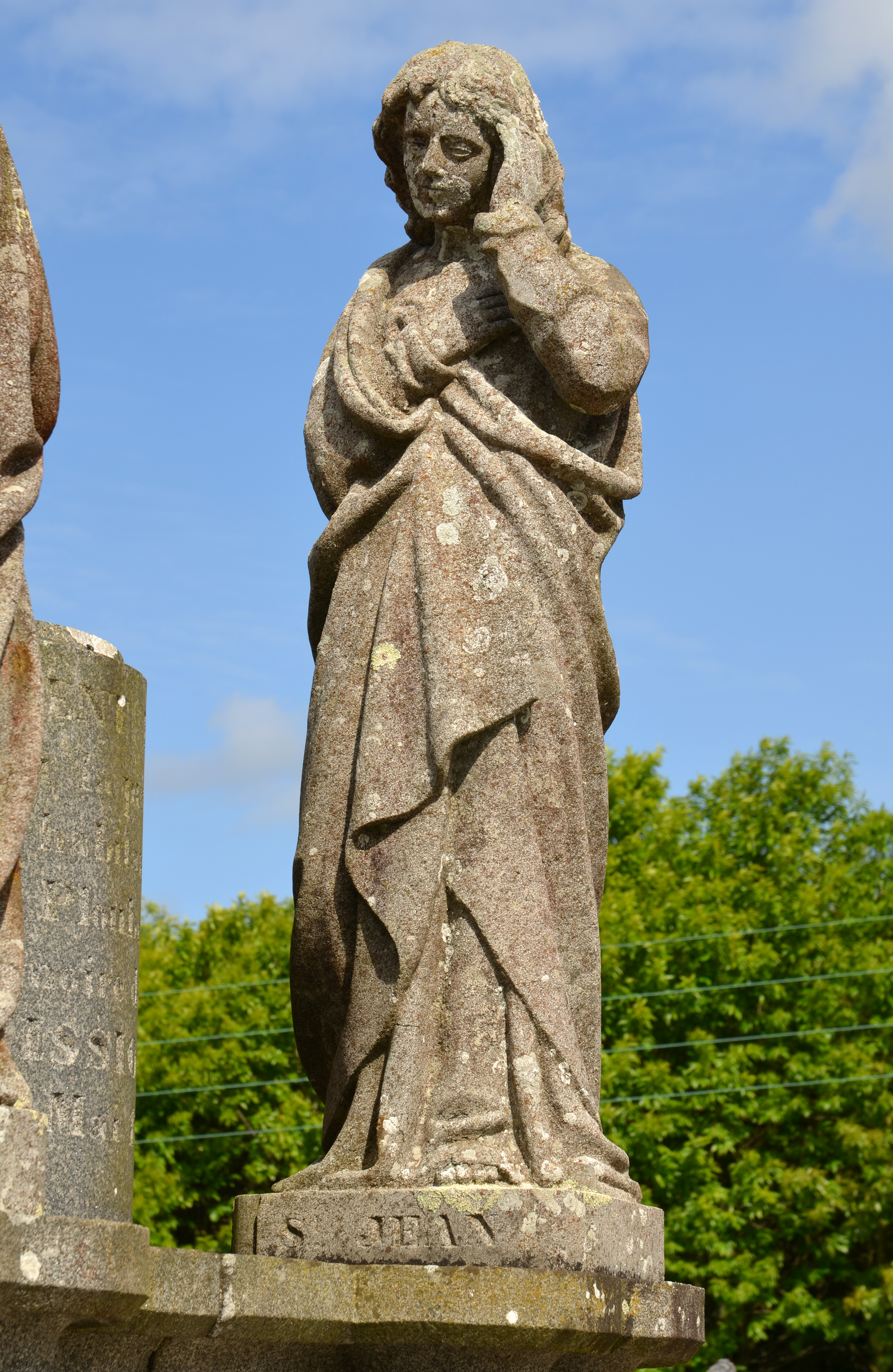 Ploubezre, le cimetière : vue de la croix de mission depuis l'est, détail de l'emmarchement et du soubassement massif supportant quatre statues. Ici, saint JeanImmatriculation