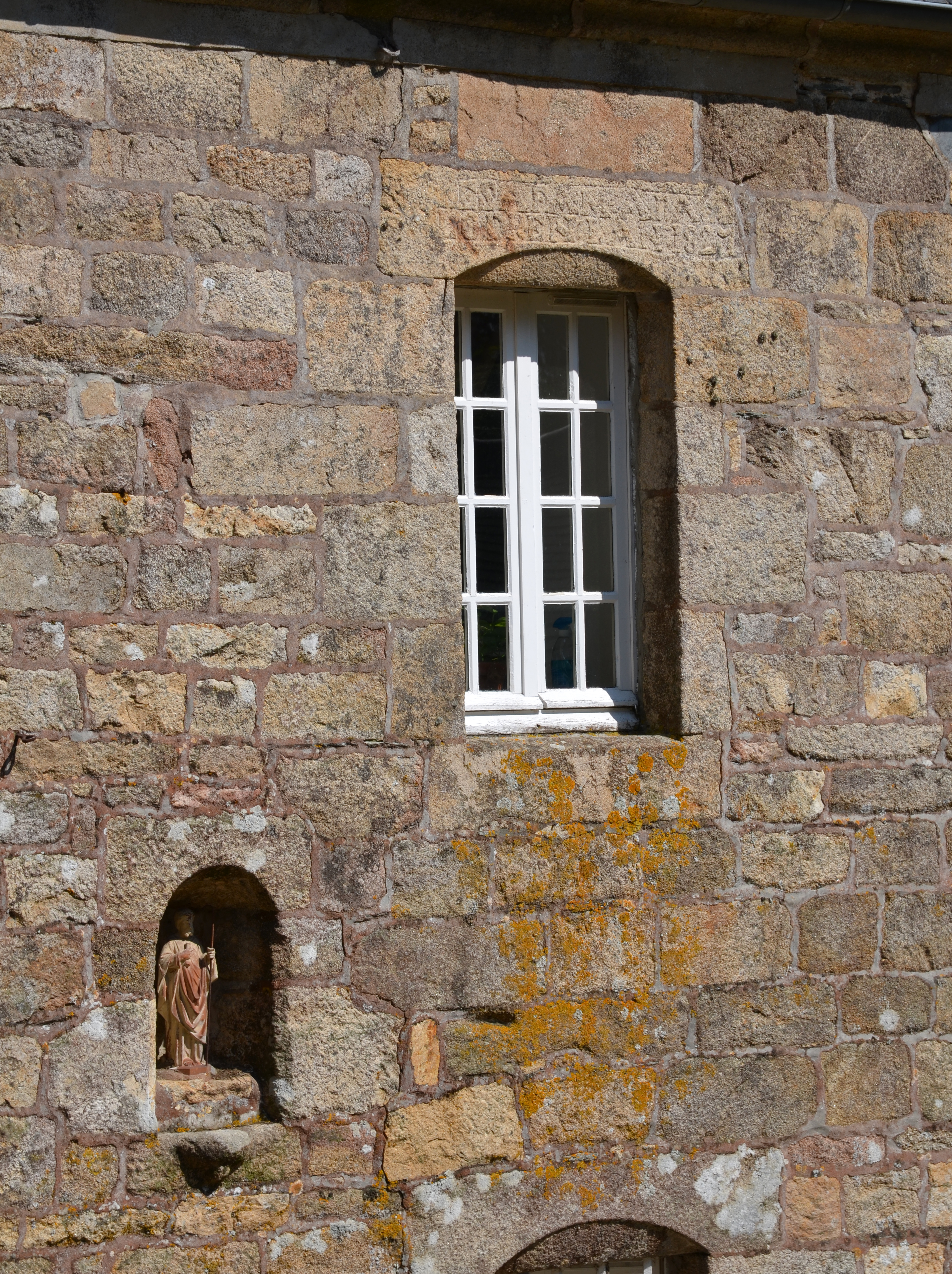 Ploubezre, Kerguiniou : logis de ferme sud, élévation antérieure orientée vers l'ouest. Sur le linteau, on peut lire l'inscription suivante : "E SA FAME : ANA / LODREN:L AN 1827". Une petite niche à statue abrite une représentation de saint Médard avec sa crosse et une rouleau de parcheminImmatriculation