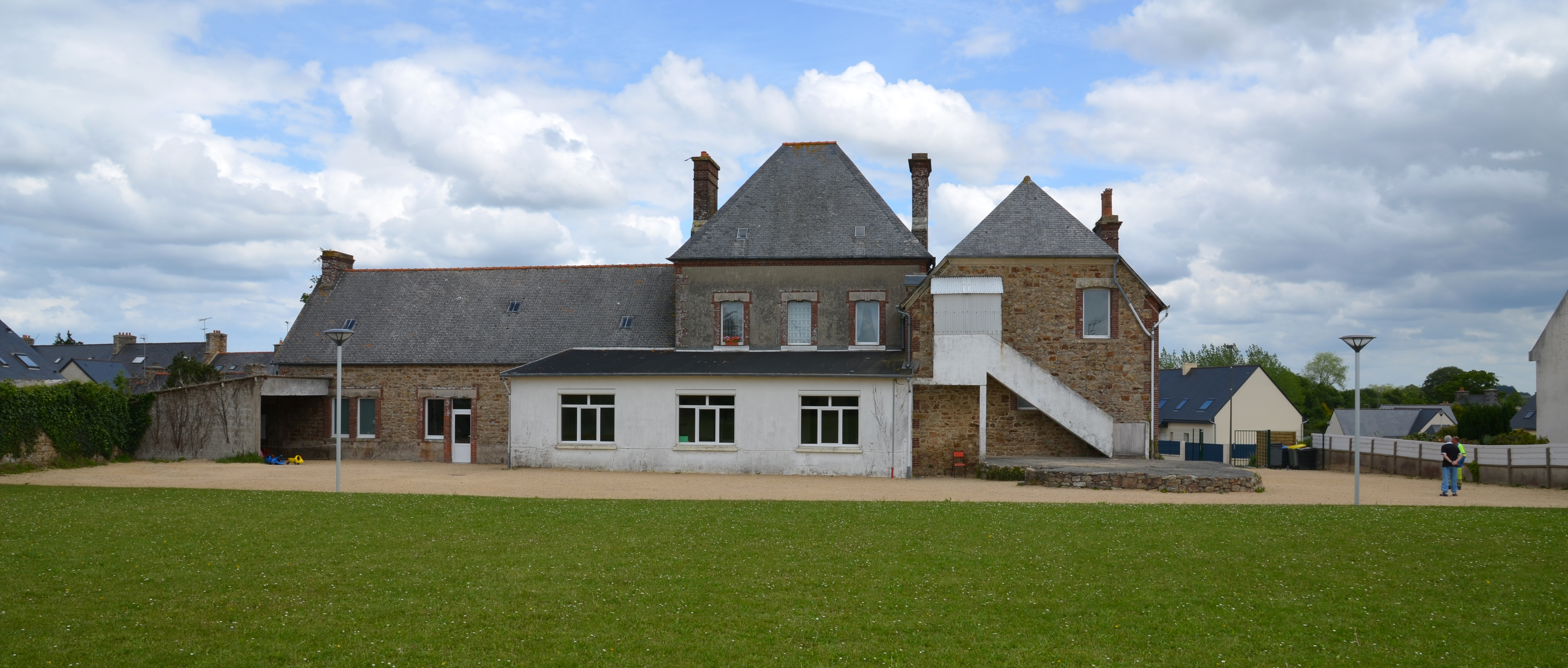 Ploubezre, rue Jean-Marie Le Foll : ancienne école des filles Saint-Louis aujourd'hui centre de loisir, vue générale depuis l'ouest. Son extension est datée par millésime de 1896Immatriculation