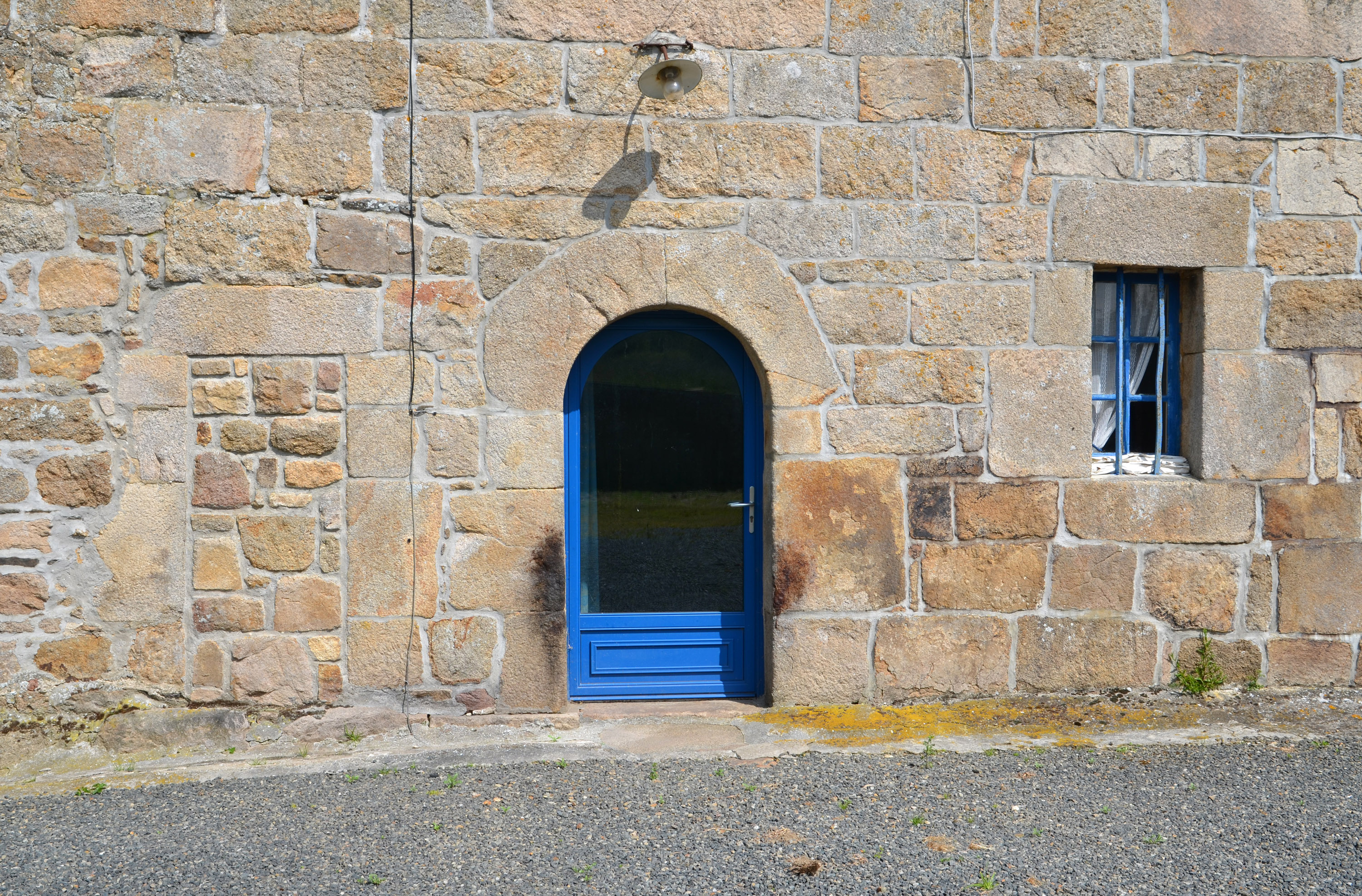 Ploubezre, Convenant Droniou : logis de ferme, détail de l'élévation antérieure orientée vers le sud ; porte en arc plein cintre et porte à linteau droit aujourd'hui muréeImmatriculation