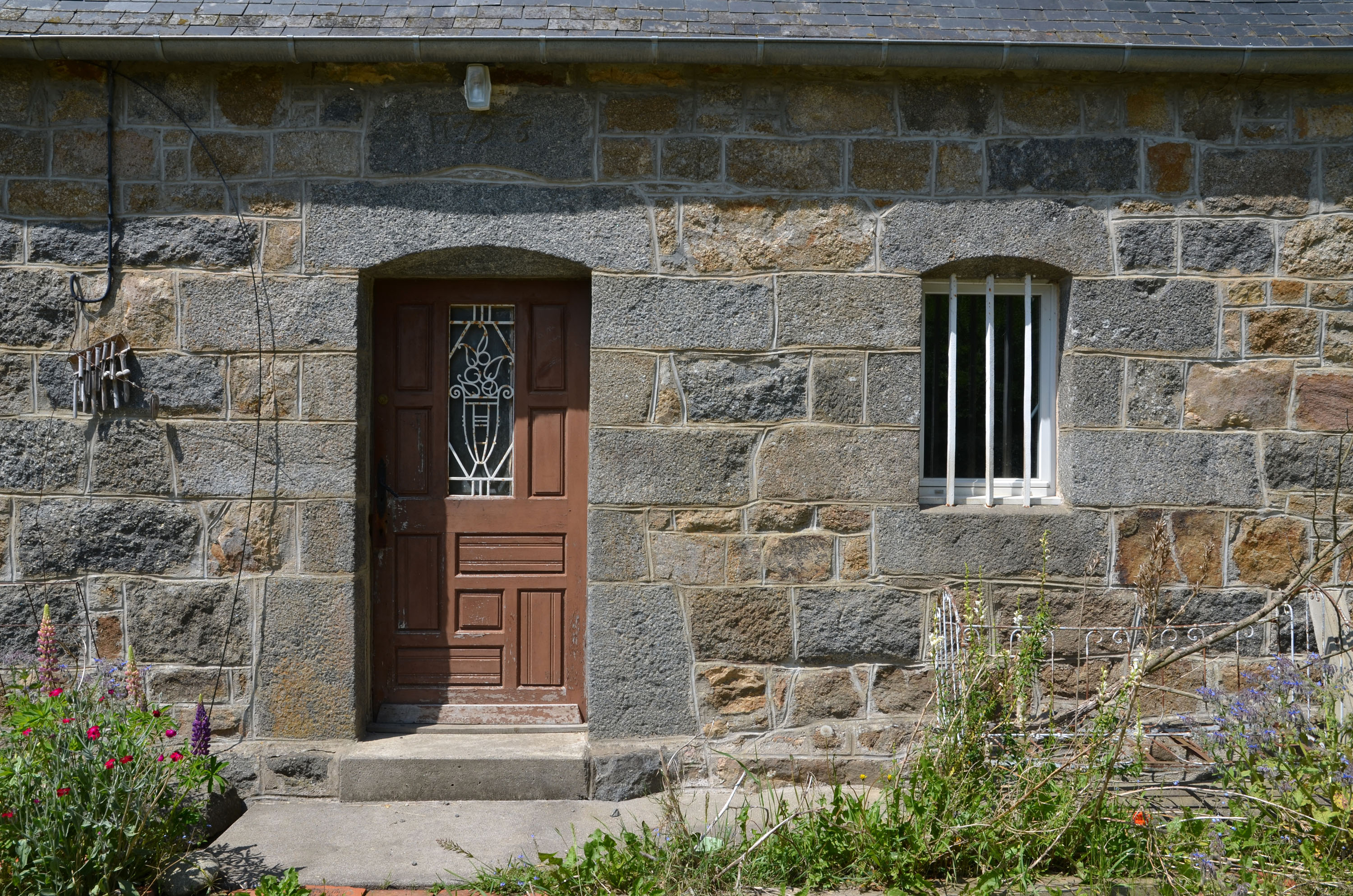 Ploubezre, Hent Meur : ferme, élévation antérieure orientée vers le sud-est, vue de détail. Le logis est daté par millésime de 1796Immatriculation