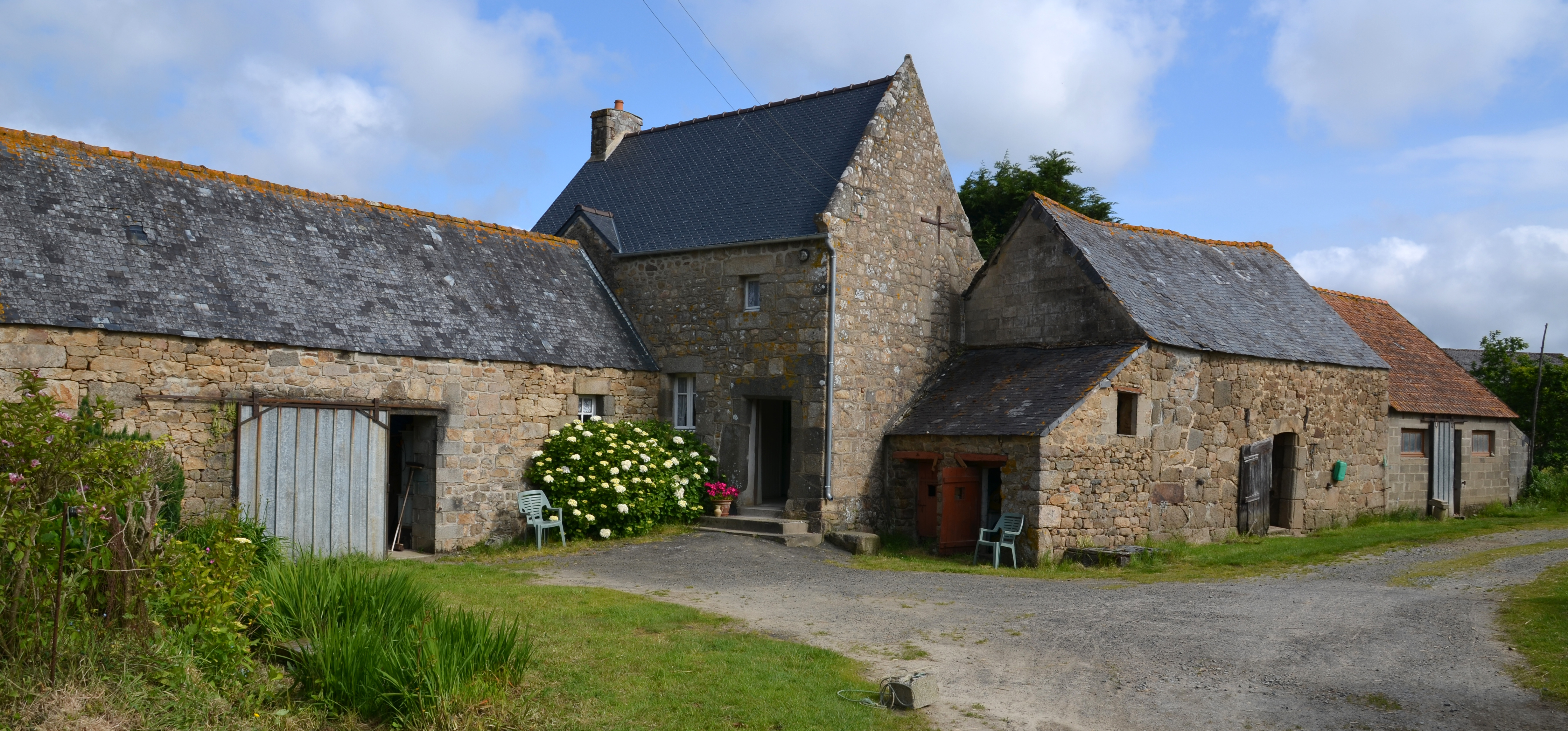 Ploubezre, Convenant Coquart Lozahic (Convenant Lozahic) : ferme, vue générale depuis le sud. Le logis date du 17e siècle et a été modifié au fil du temps (porte haute en arc plein cintre murée dans le pignon est). Une pierre porte le millésime 1784 qui atteste de travaux à cette dateImmatriculation