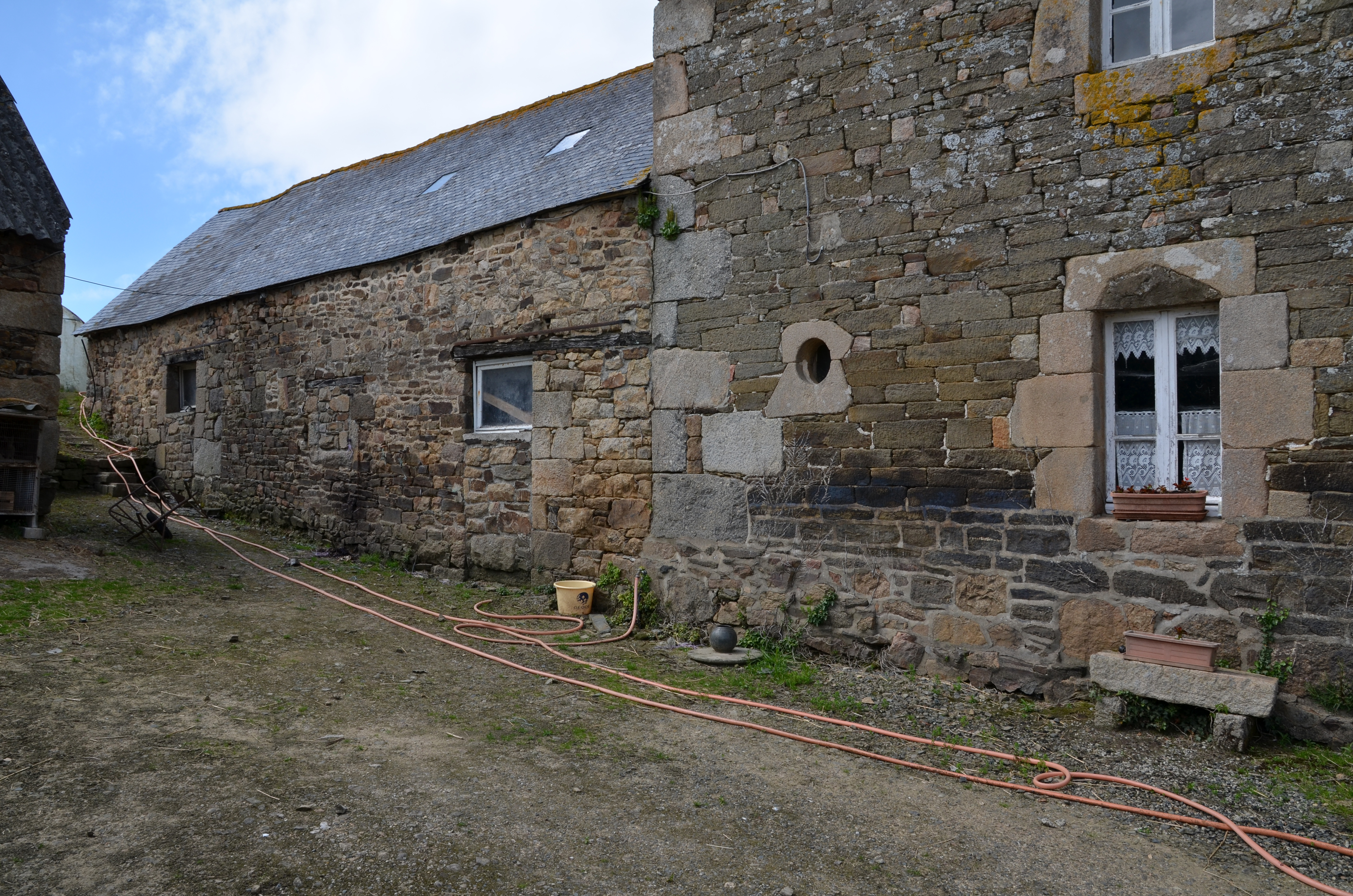 Ploubezre, rue Yves Le Cudennec : logis de ferme, élévation antérieure orientée vers le sud, détail de l'appareillage de la façade en moellon équarri de grès schisteux et pierre de taille de granite en entourage des ouvertures et chaînage d'angle. L'étable - datable du 19e siècle (portes sud murées), est située dans l'alignement du logis à l'ouestImmatriculation