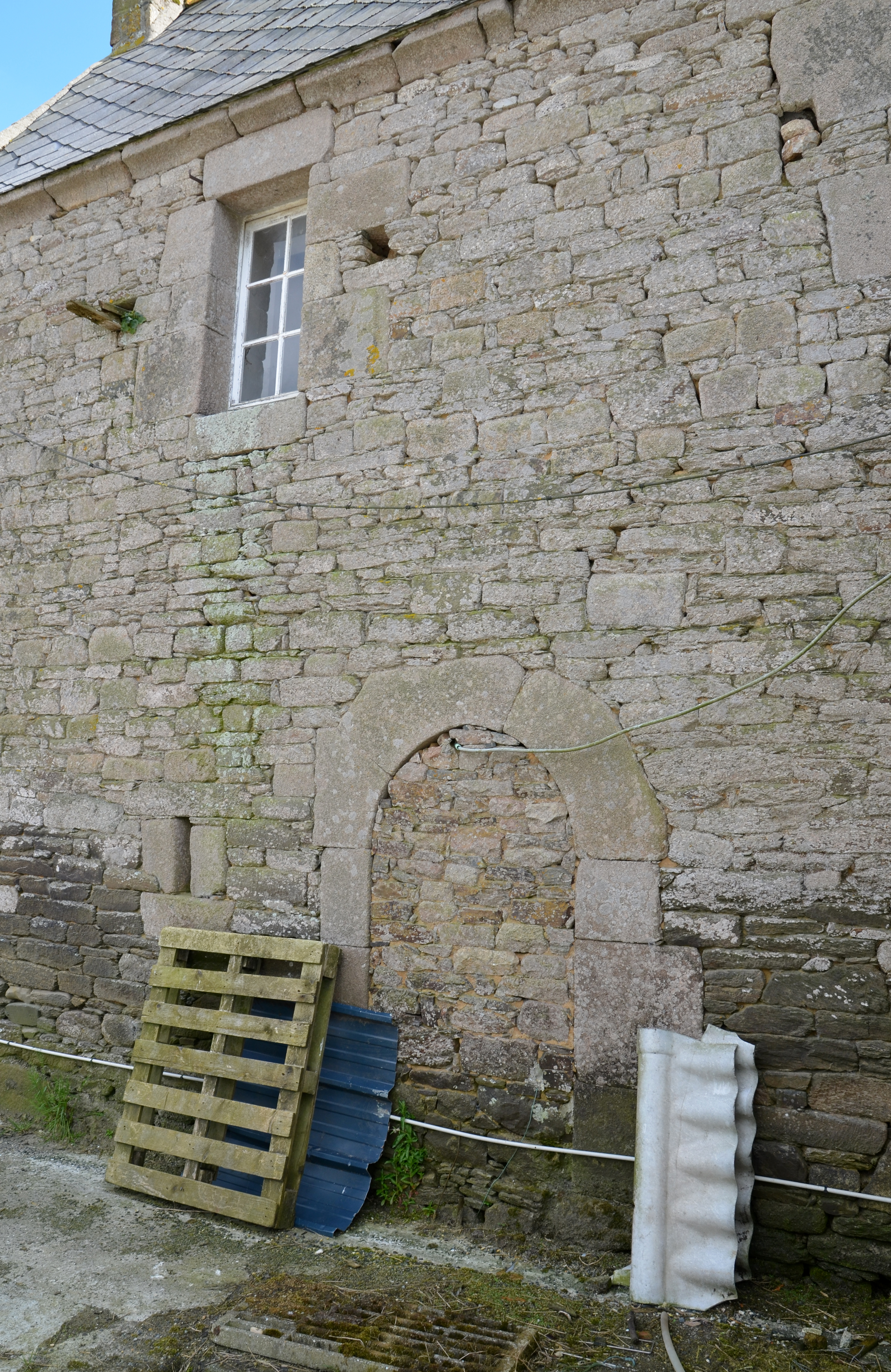 Ploubezre, rue Yves Le Cudennec : logis de ferme, élévation postérieure orientée vers le nord, porte en arc plein cintre murée et saloir mural à jour. La façade arrière est montée en moellon équarri de graniteImmatriculation