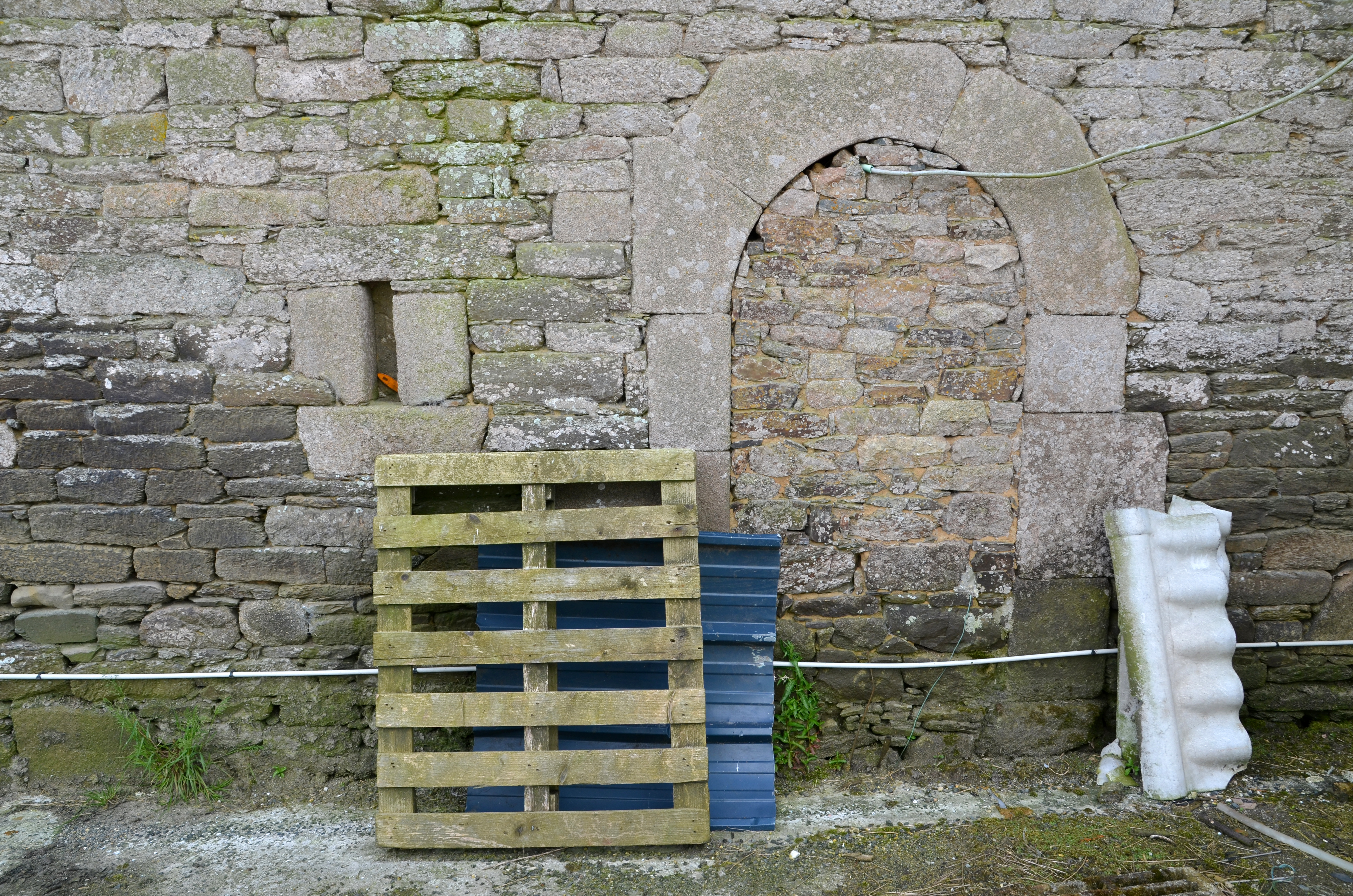 Ploubezre, rue Yves Le Cudennec : logis de ferme, élévation postérieure orientée vers le nord, porte en arc plein cintre murée et saloir mural à jour. La façade arrière est montée en moellon équarri de graniteImmatriculation