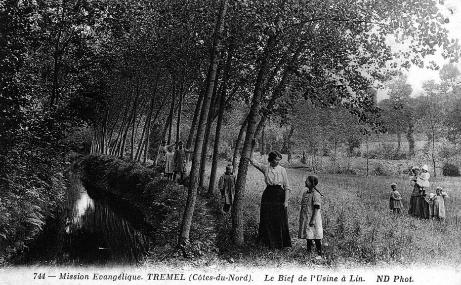 Trémel, Uzel : Mission évangélique bretonne, mission protestante, bief alimentant en eau l'usine à lin, carte postale (collection particulière)Immatriculation