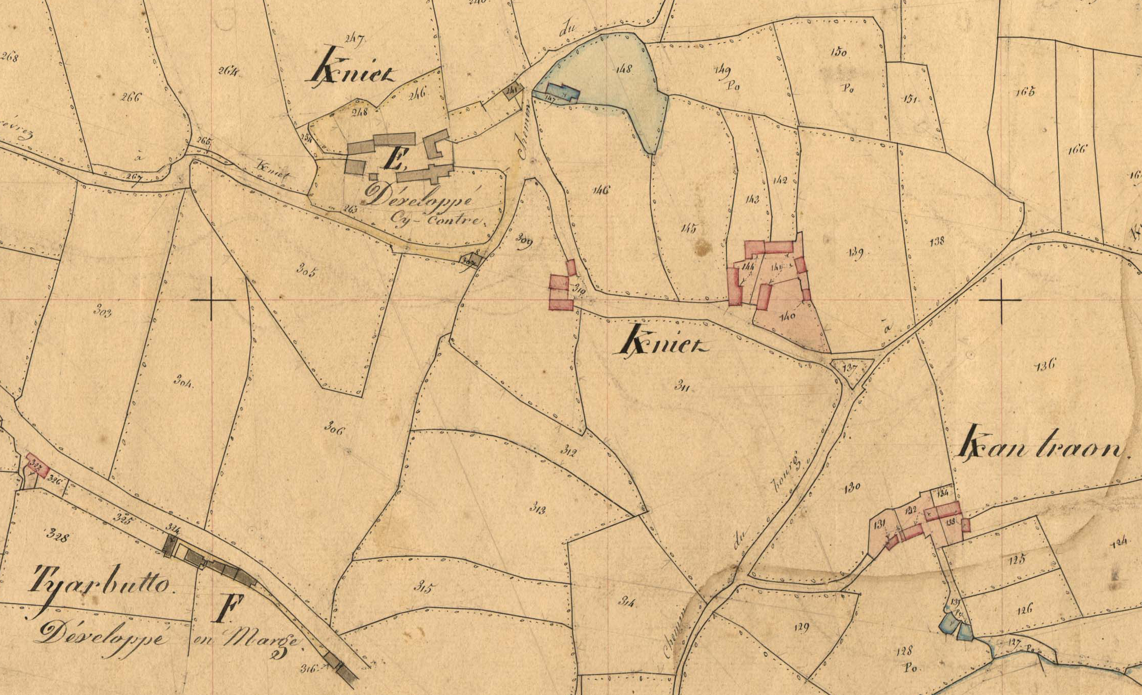 Extrait du cadastre ancien de la commune de Trémel, 1848 : K[er]niet (le Vieux Presbytère est figuré en bleu : parcelles n° 147 et 148)Immatriculation